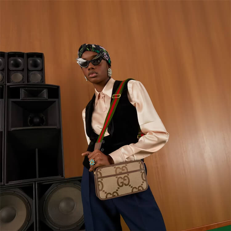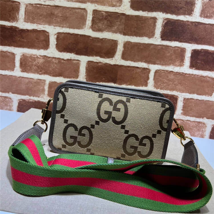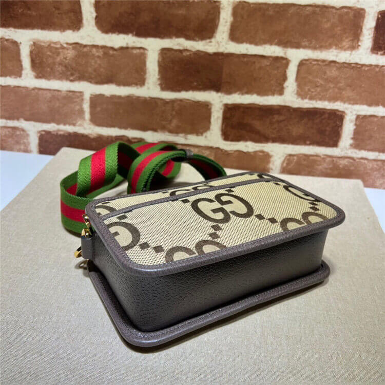 1:1 Mirror Quality Replica Gucci Jumbo GG Mini Bag Style:696075 UKMDG 2570 Camel and ebony jumbo GG canvas Brown leather trim Green and red Web Cotton linen lining Inside: 1 pocket with button Outside: 1 pocket Shoulder strap with 23.6″ drop Zip closure 8.8″W x 5.5″H x 2.7″D The model is 6″ tall