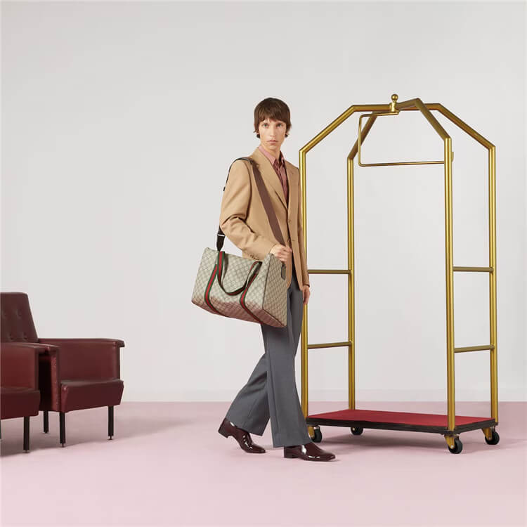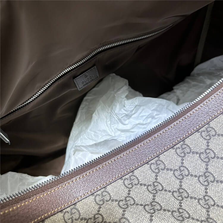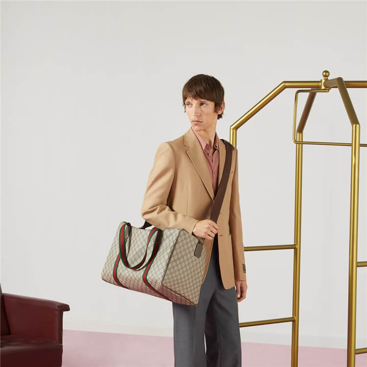 1:1 Mirror Quality Replica Gucci Large Duffle Bag With Web Style:758664 FACK7 9768 Beige and ebony Soft GG Supreme Brown leather trim Green and red Web Leather detail with Gucci script logo Top handle with 20cm drop Shoulder strap Zip closure W45.5cm x H29cm x D27cm