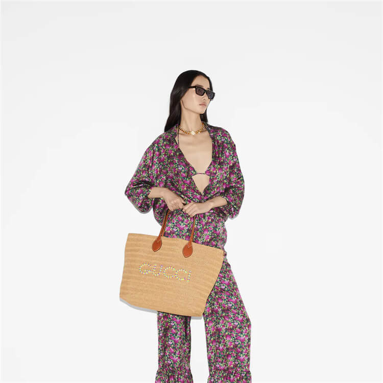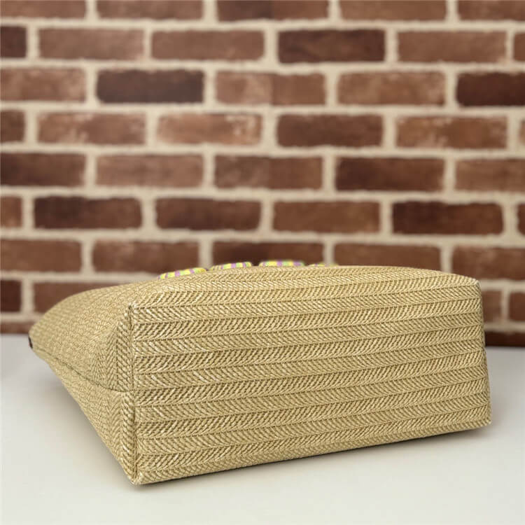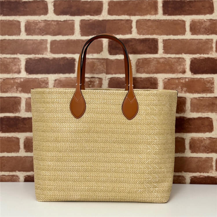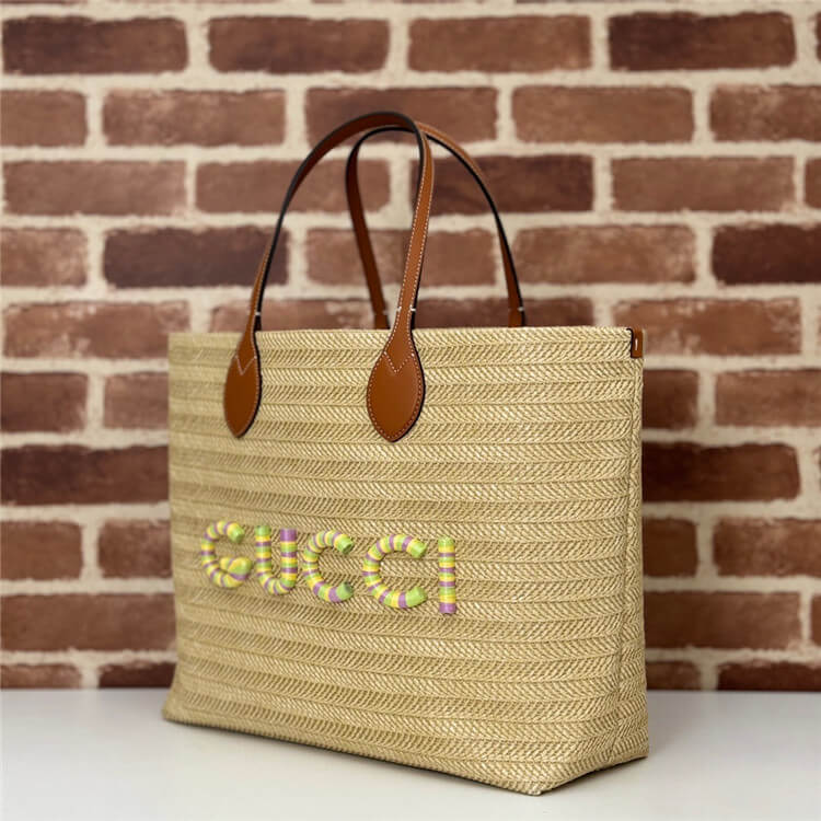 1:1 Mirror Quality Replica Gucci Medium Straw-Effect Tote Style:779666 FAC42 9561 Natural straw effect raffia and viscose Brown leather trim Multicolor straw Gucci patch Cotton linen lining Inside: 1 open pocket Top handle with 7.9″ drop Medium: 15″W x 13″H x 6″D