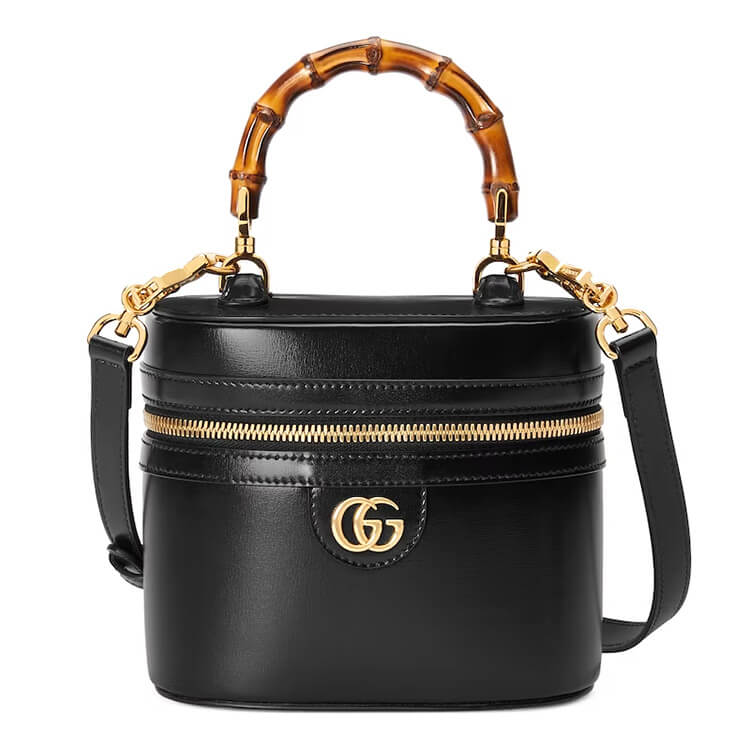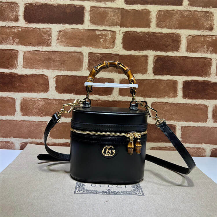 1:1 Mirror Quality Replica Gucci Mini Bamboo Shoulder Bag Style:760200 10O0G 1000 Black leather Gold-toned hardware Bamboo handle Double G Handle with 3.5″ drop Detachable and adjustable shoulder strap with 19.6″ drop Zip closure Mini size: 6″W x 5.3″H x 1.5″D