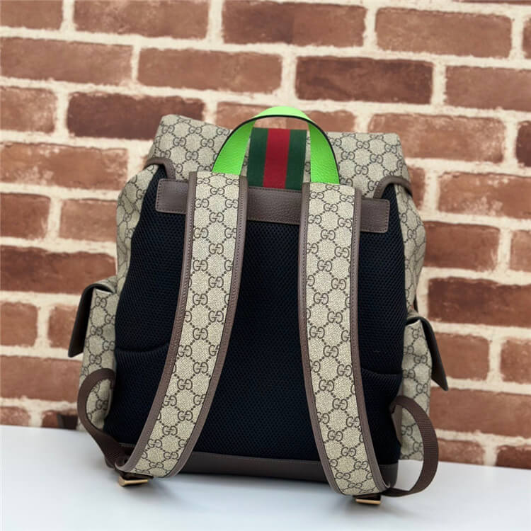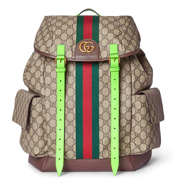 Drawstring and flap closure with leather buckled straps and additional magnetic closure for easy opening