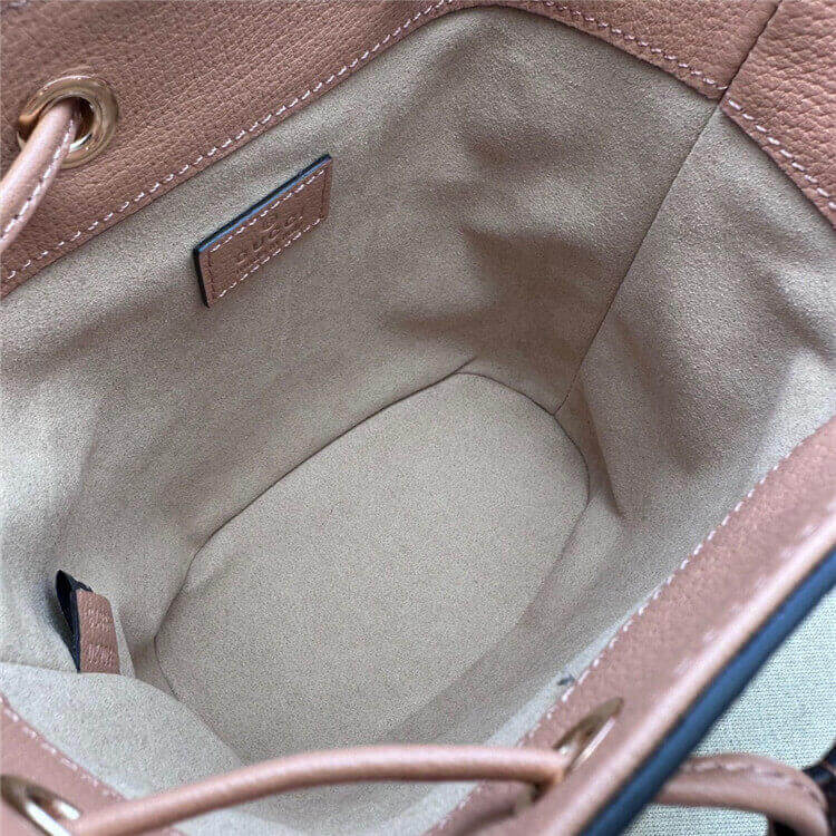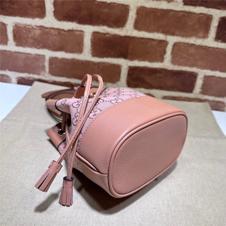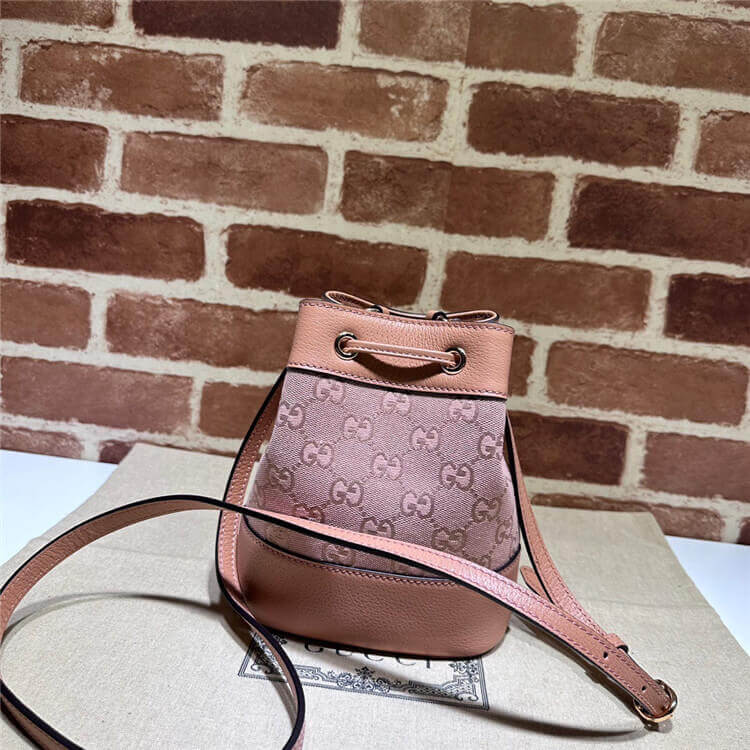 1:1 Mirror Quality Replica Gucci Ophidia GG Mini Bucket Bag Style:550620 FACC5 5748 Pink GG canvas Pink leather trim Rose gold hardware Microfiber lining with suede-like finish Adjustable strap with 23″ drop Drawstring closure Weight: .28 kg approximately 6″W x 7.5″H x 3.5″D