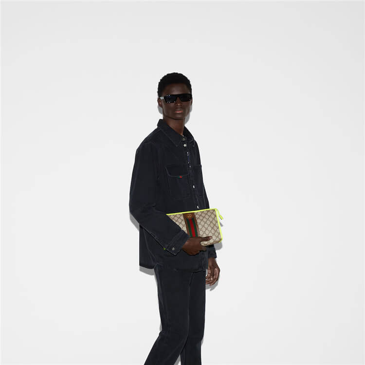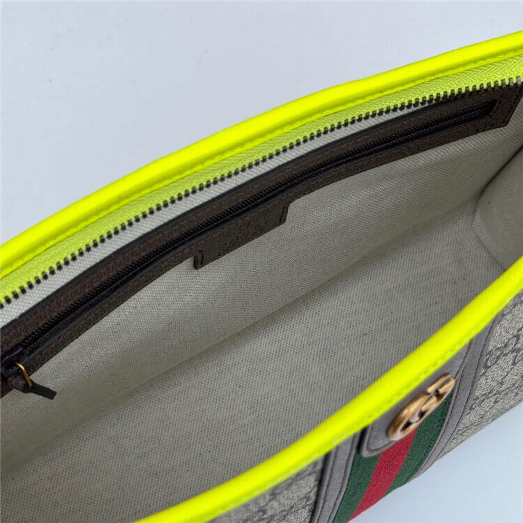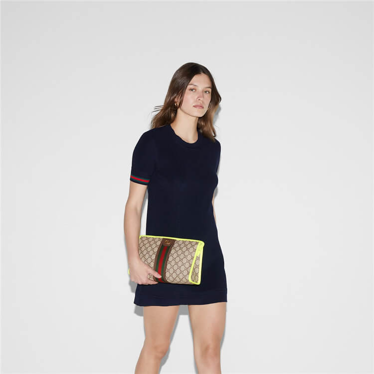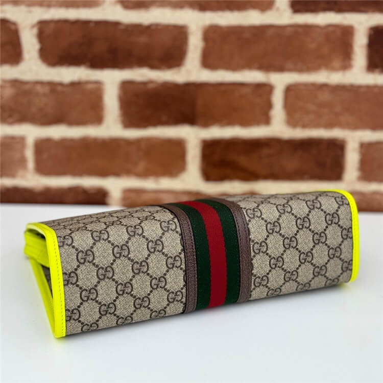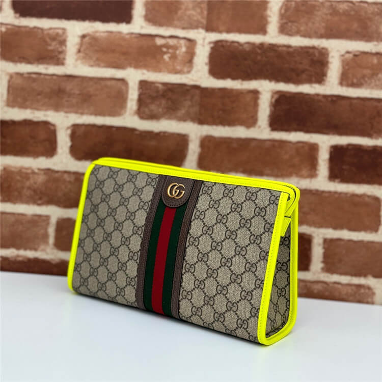1:1 Mirror Quality Replica Gucci Ophidia GG Pouch Style:598234 FADI7 9765 Beige and ebony GG Supreme canvas Fluorescent yellow leather trim Gold-toned hardware Green and red Web Cotton linen lining Double G Interior zipper pocket Zipper closure 11.2″W x 7″H x 3.5″D