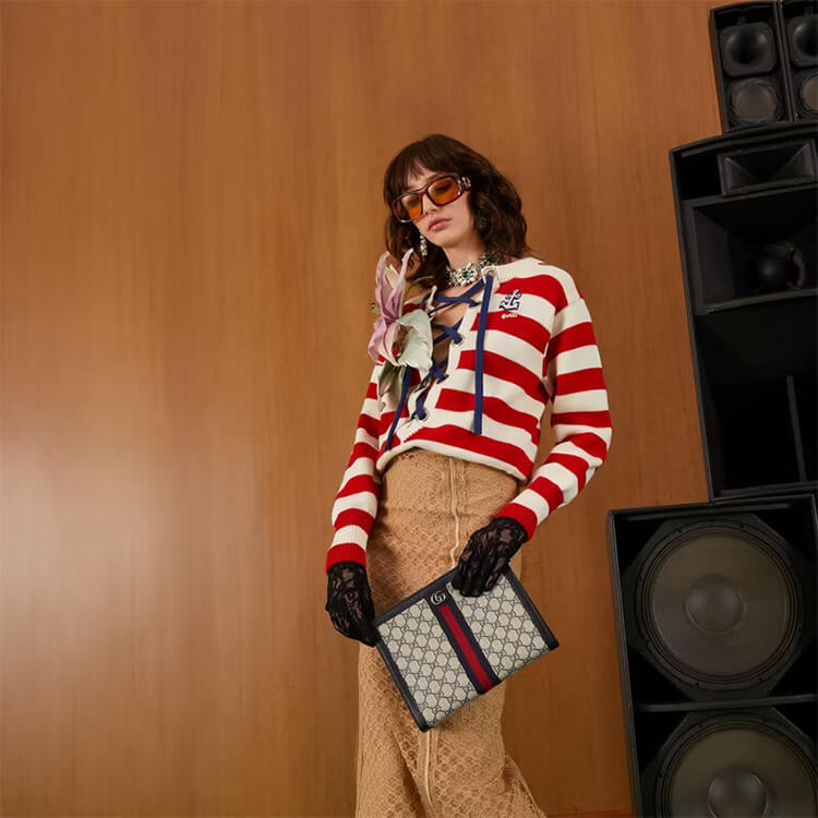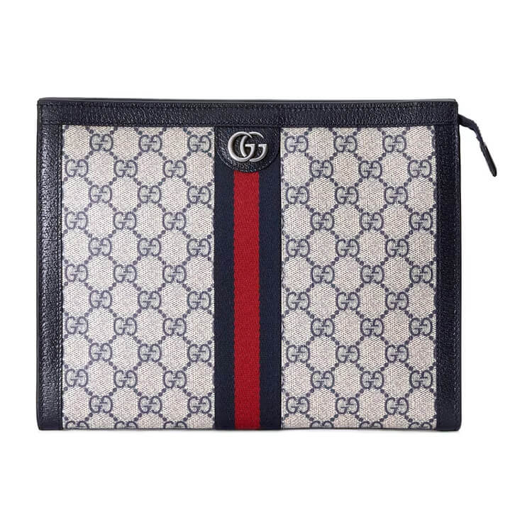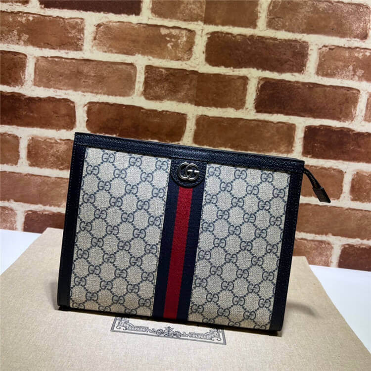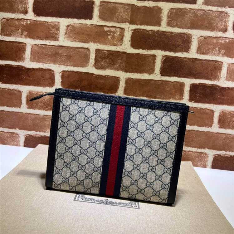 1:1 Mirror Quality Replica Gucci Ophidia GG Pouch Style:625549 96IWN 4076 Beige and blue GG Supreme canvas Blue leather trim Palladium-toned hardware Blue and red Web Double G Interior: 1 open pocket Zipper closure 10.6″W x 8.3″H x 2.75″D The model is 5’7″ tall