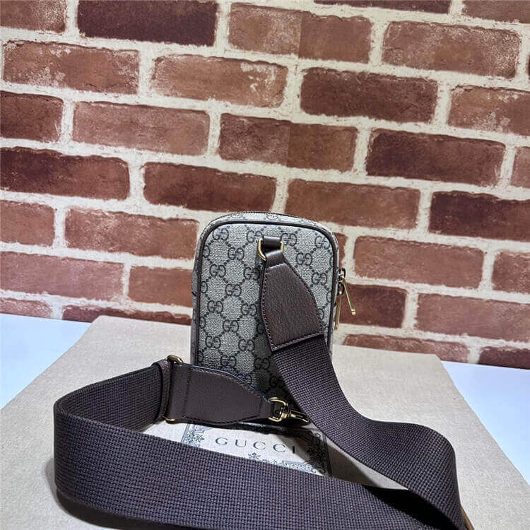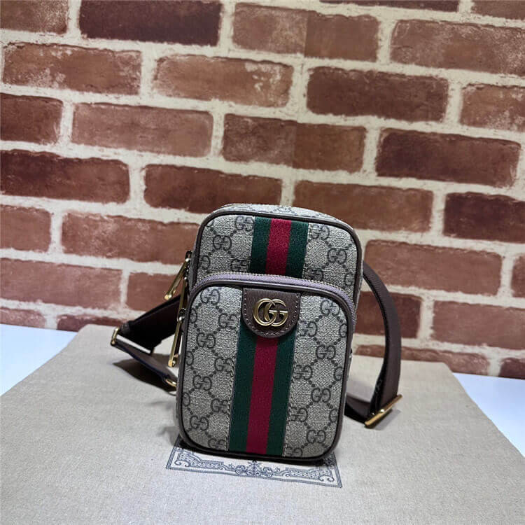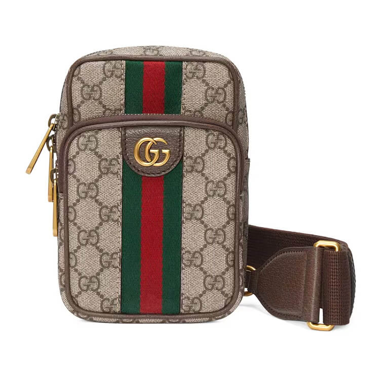 1:1 Mirror Quality Replica Gucci Ophidia Mini Bag Style:752565 9C2ST 8746 Beige and ebony GG Supreme canvas Brown leather trim Gold-toned hardware Green and red Web Cotton linen lining Double G Inside: 2 card slots External zip pocket Shoulder strap with 20.5″ drop Zip closure 4.7″W x 7.1″H x 2.7″D