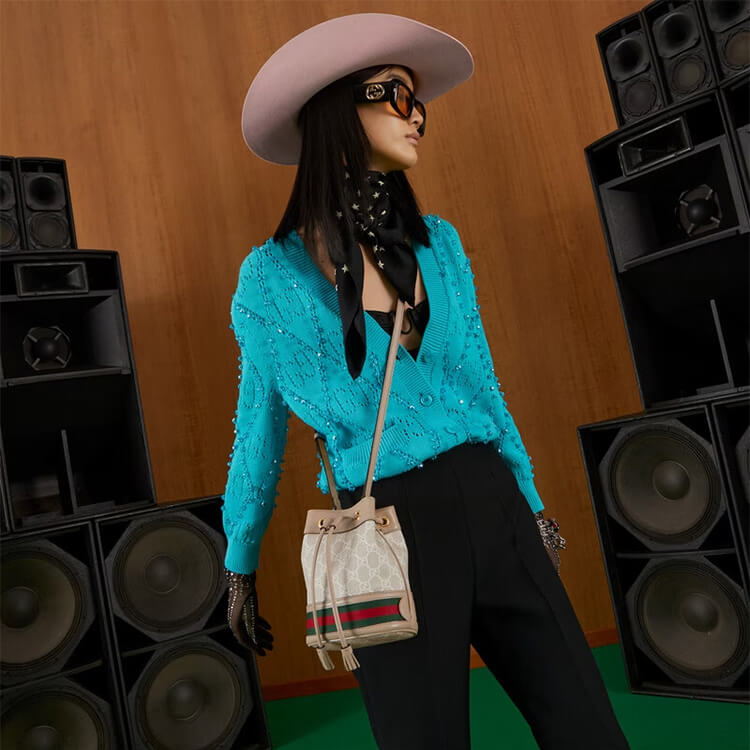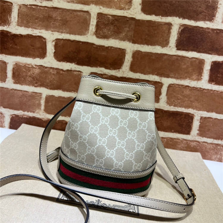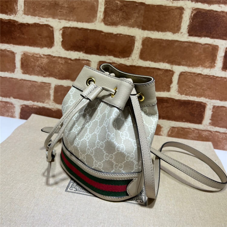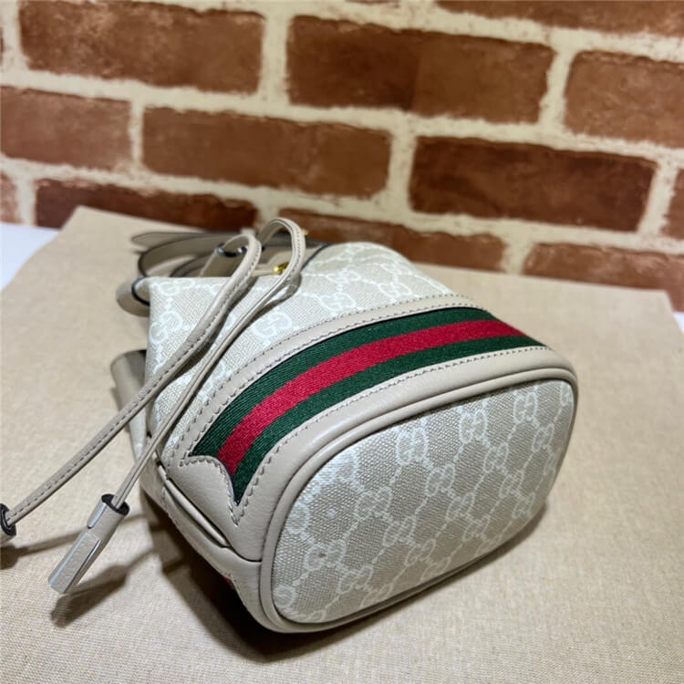 1:1 Mirror Quality Replica Gucci Ophidia Mini GG Bucket Bag Style:550620 UULEG 9682 Beige and white GG Supreme canvas Oatmeal leather trim Green and red Web Cotton linen lining Adjustable strap with 23″ drop Drawstring closure Weight: .28 kg approximately 6″W x 7.5″H x 3.5″D
