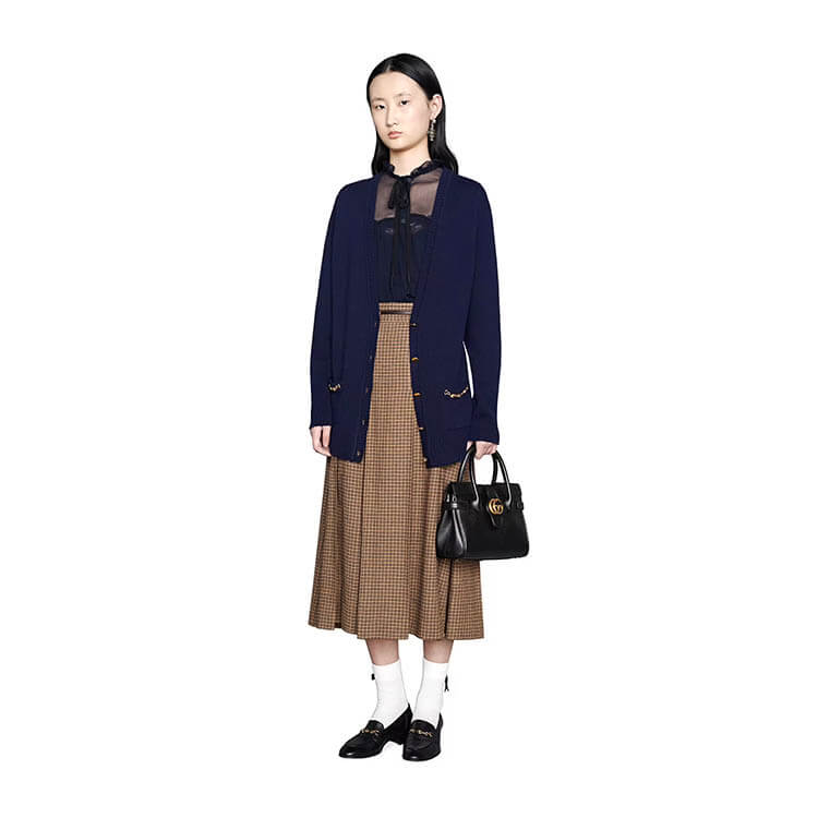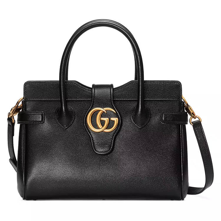 1:1 Mirror Quality Replica Gucci Small Top Handle Bag With Double G Style:658450 1U10T 1000 Black leather Gold-toned hardware Microfiber lining with a suede-like finish Double G Handle drop: 3.5″ Detachable shoulder strap drop: 19.6″ Small size: 9.8″W x 7″H x 4.3″D The model is 5’8″ tall.
