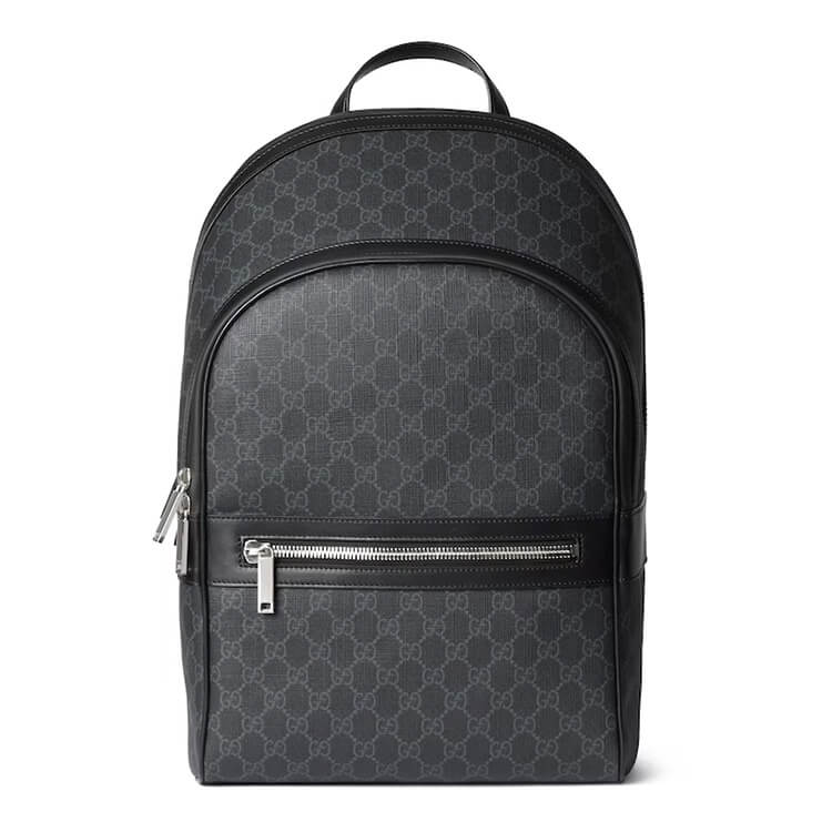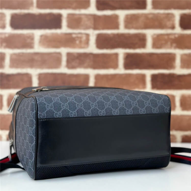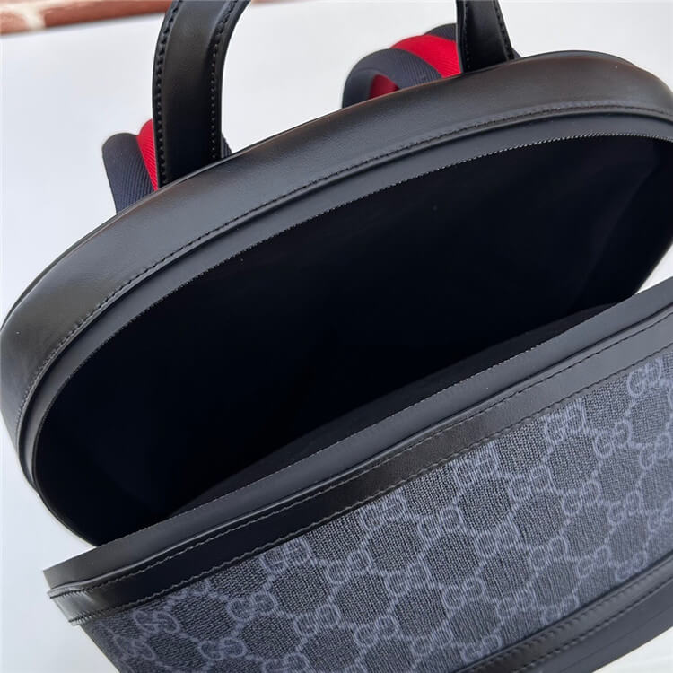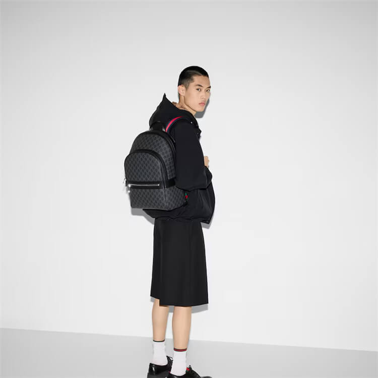 1:1 Mirror Quality Replica Gucci GG Backpack Style:792123 FADJN 1044 Black GG Supreme canvas Black leather trim Blue and red Web Cotton linen lining Adjustable Web shoulder straps Padded mesh back Outside: 1 front zip pocket Top handle with 5.5cm drop Zip closure W28cm x H44cm x D15.5cm The model is 185 cm tall