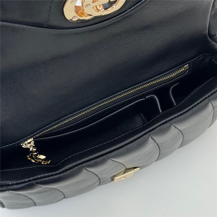 1 zip pocket with GG charm, 1 open pocket and 1 lipstick holder compartment