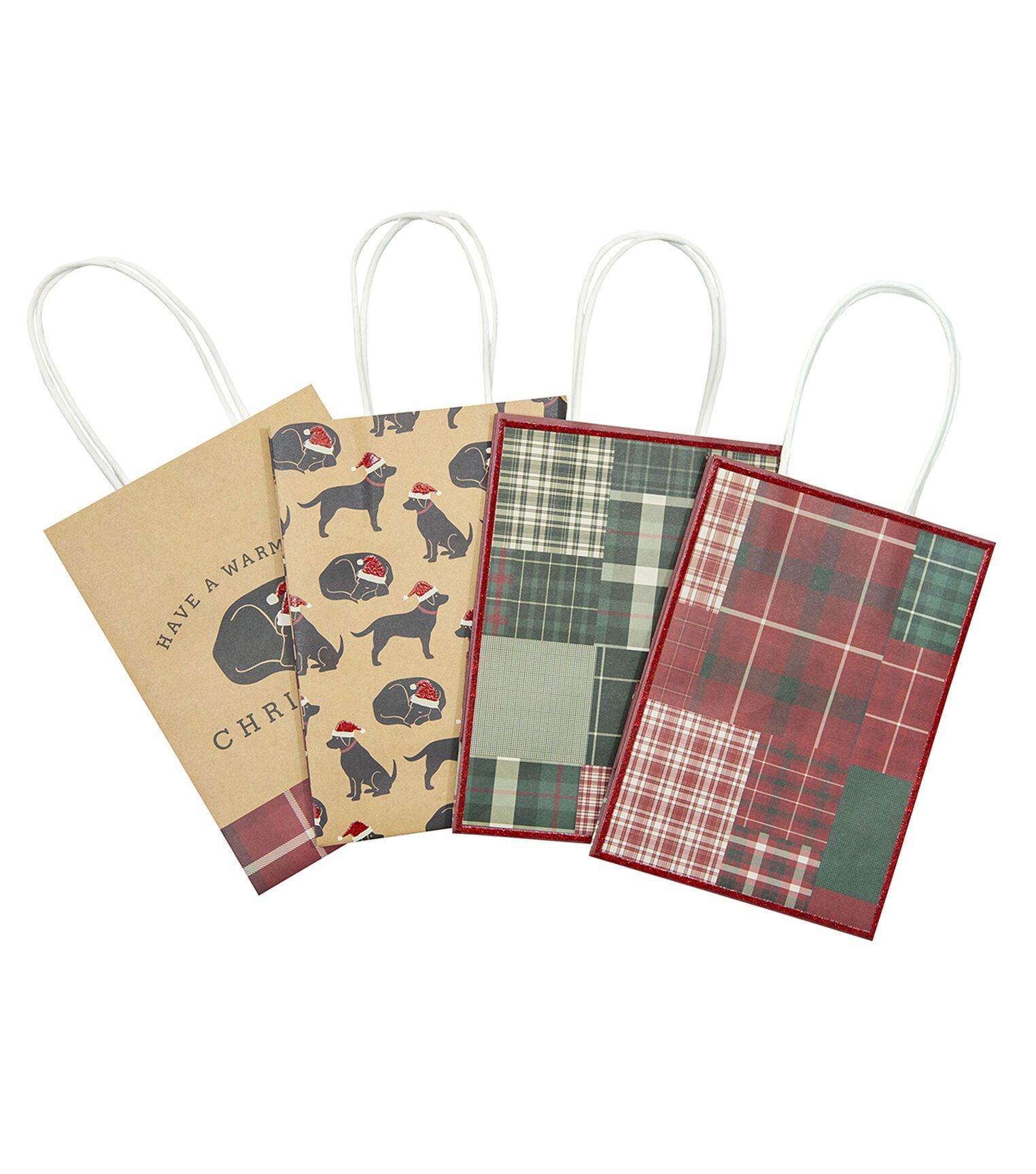 Give a festive touch to the holiday gifts meant for your loved ones with the Christmas Warm Cozy & Puppy Gift Bags by Place & Time. This pack includes four gift bags. Two of them sport plaid patterns in festive hues. The rest two flaunts a print of a dog wearing a Santa hat. You can attach coordinating bows to them to make the bags more attractive.