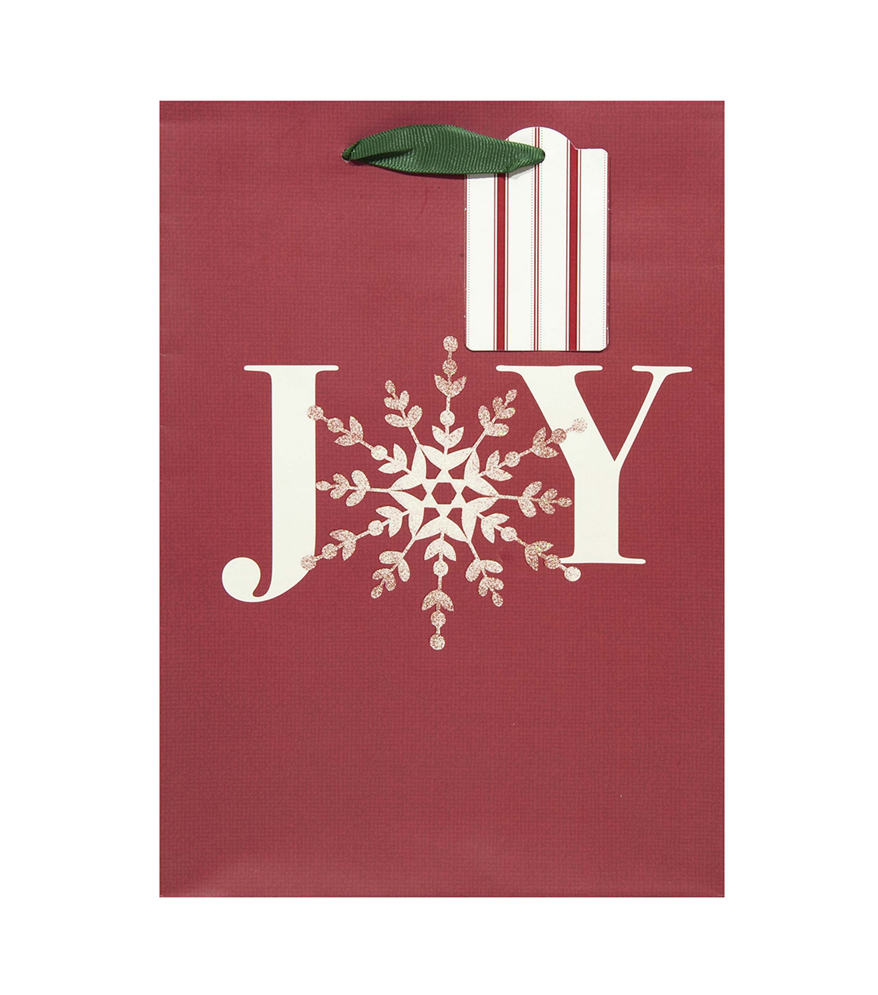 The Christmas Joy on Red Gift Bag by Place & Time is sure to add an extra dose of festivity to your gift-giving ritual. This red gift bag flaunts a print of the word ‘Joy’ with a snowflake replacing the letter ‘O’ for added charm. It comes with a gift tag sporting a striped pattern and a green ribbon handle.