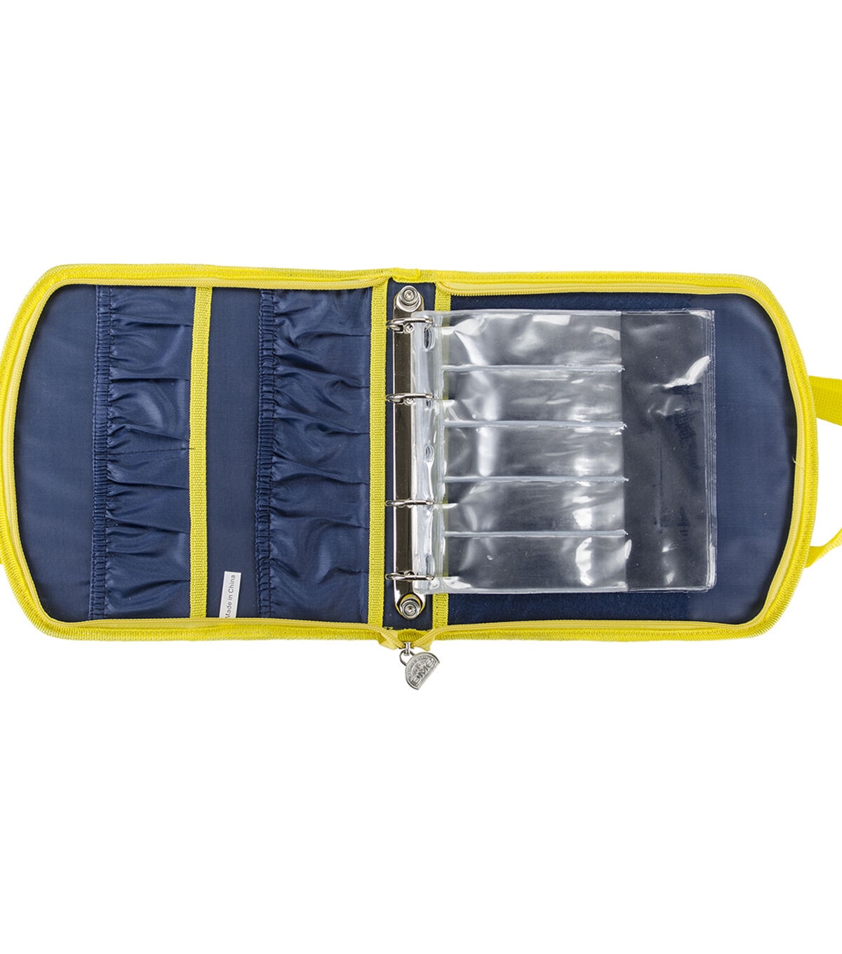 Organizing and traveling with your needlework will become easier with the DMC StitchBow Mini Needlework Travel Bag. This package contains one bag with a 3/4 zipper allowing bag to lay flat open, one five pocket clear vinyl StitchBow Binder insert (available separately,) lots of elasticized pockets for tools and more, and adjustable shoulder straps. The outer shell is made of polyester canvas. Approximate bag size is 9 x 20.5 inches when open and 10 x 9 x 1.5 inches when zipped.