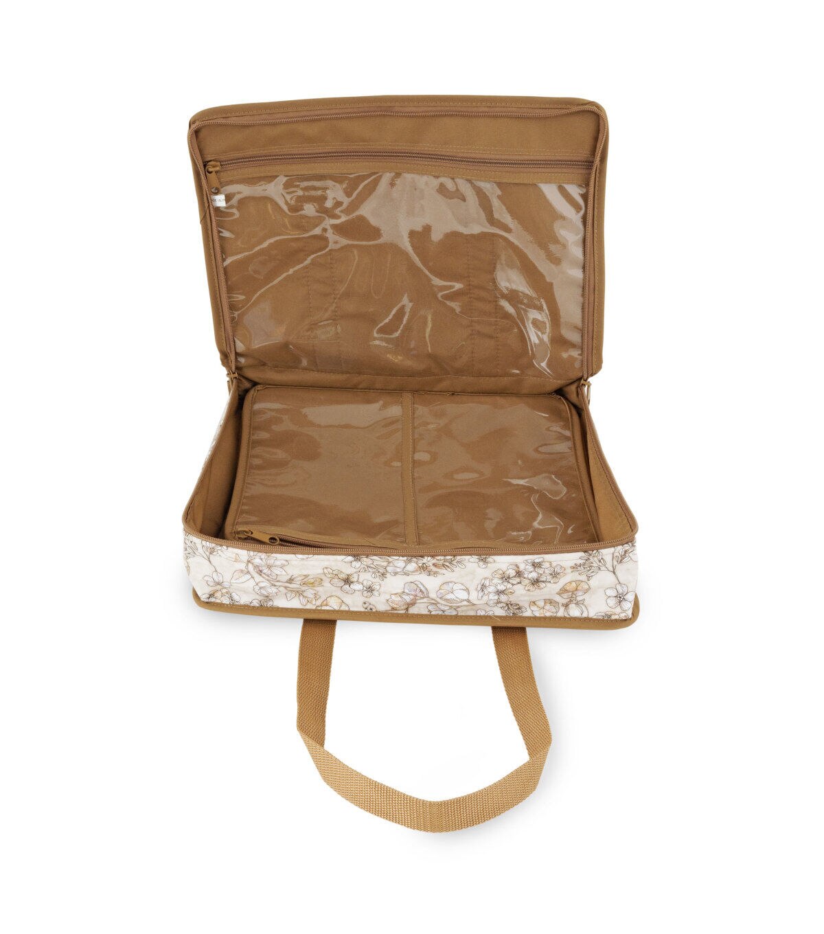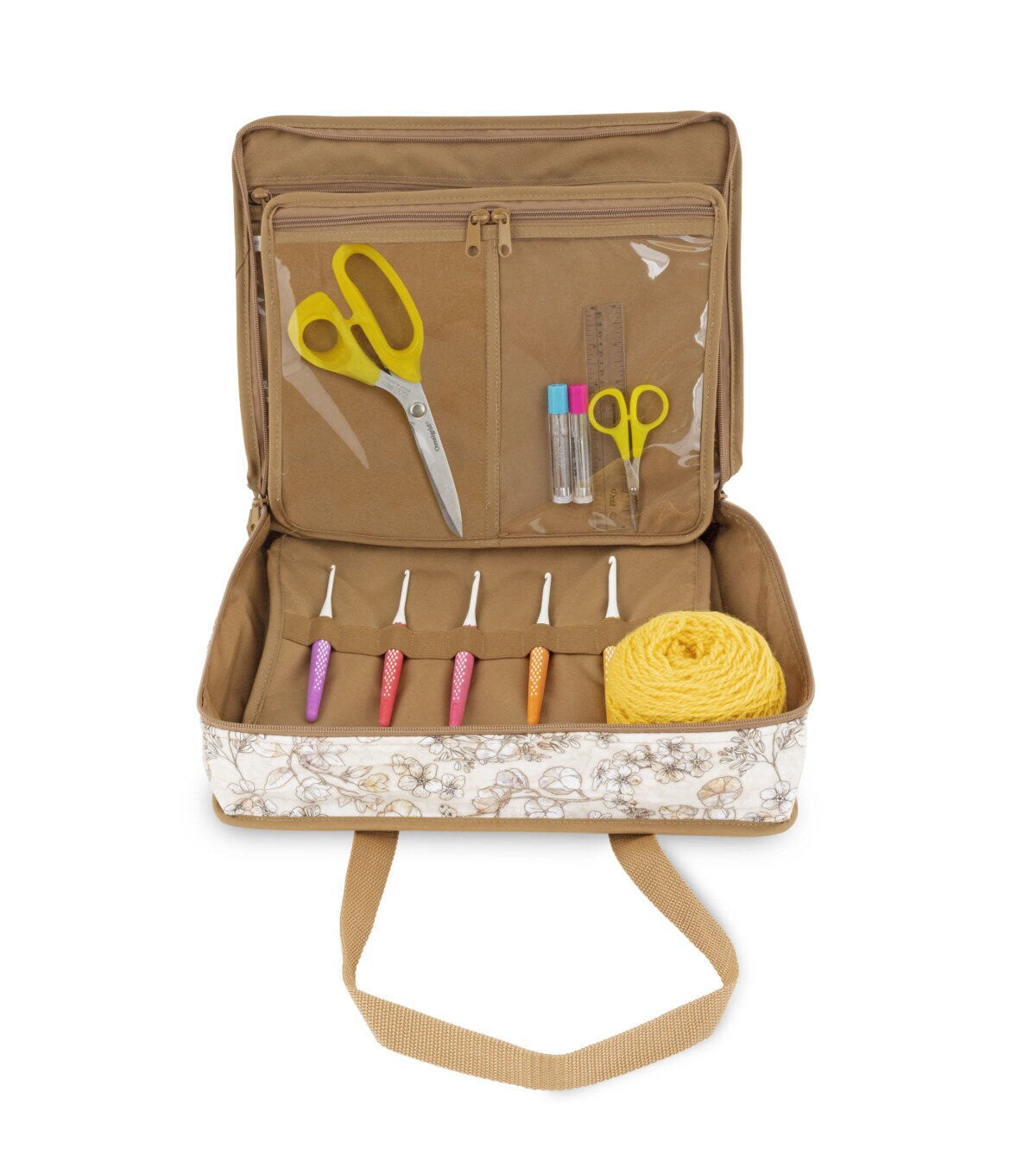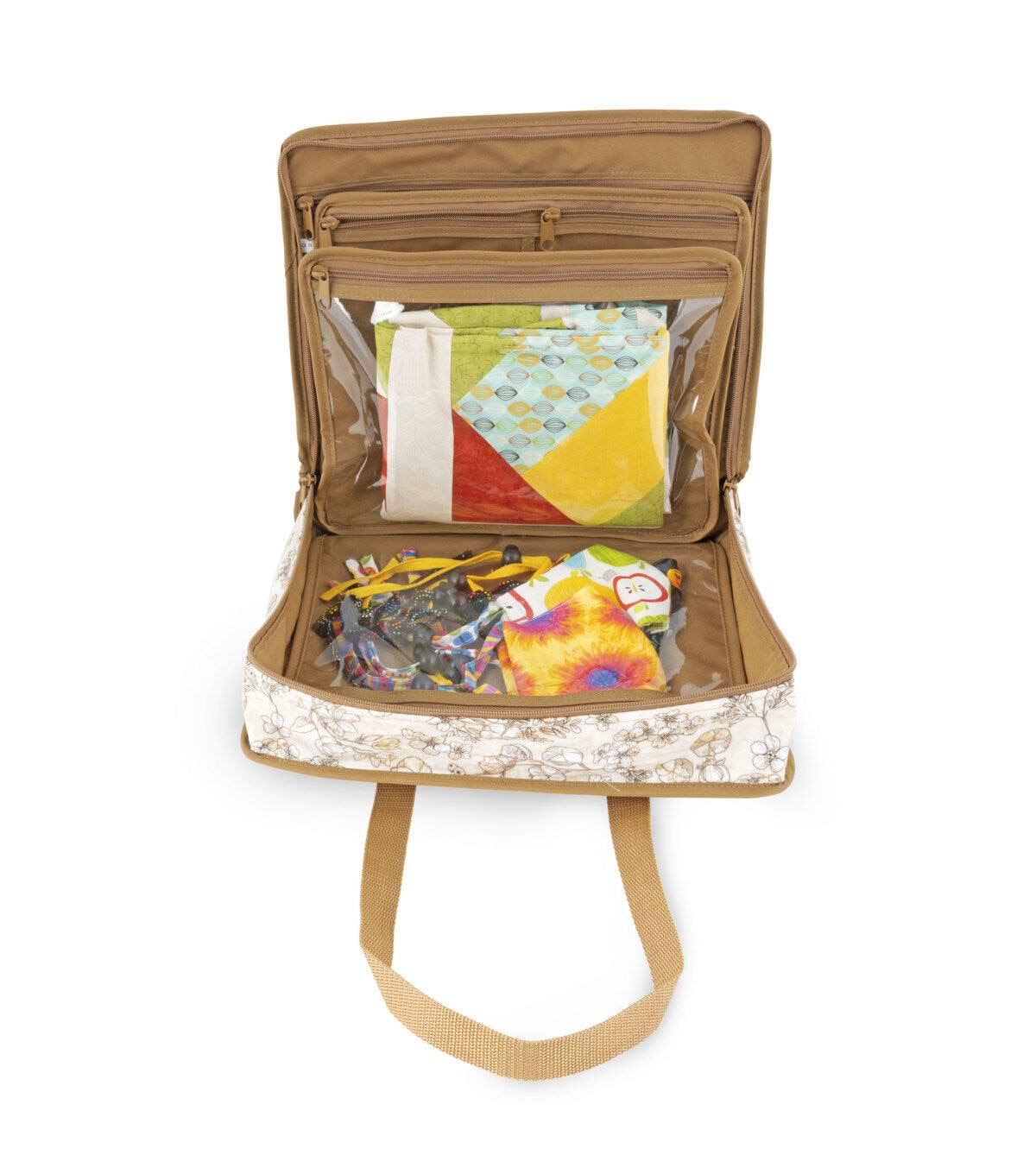 The Dritz all-purpose project organizer bag is the perfect companion for sewing, quilting, needlecraft projects on-the-go. It's a portable organizer featuring loads of pockets for keeping supplies separated and ready to use. Soft beige floral print with tan handles and trim.
