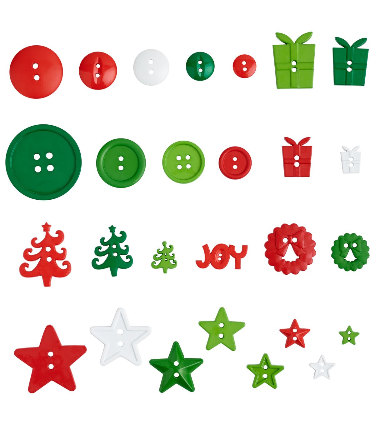 Explore endless crafting possibilities with the Favorite Findings Christmas Buttons Value Pack - Red, Green & White. These buttons sport Christmas hues and come in different shapes that include spruce trees, the word ‘Joy,’ star and more. They will look great on a coat, jacket, handmade sweater and more. You can also use them to accentuate photo frames and scrapbooking projects.