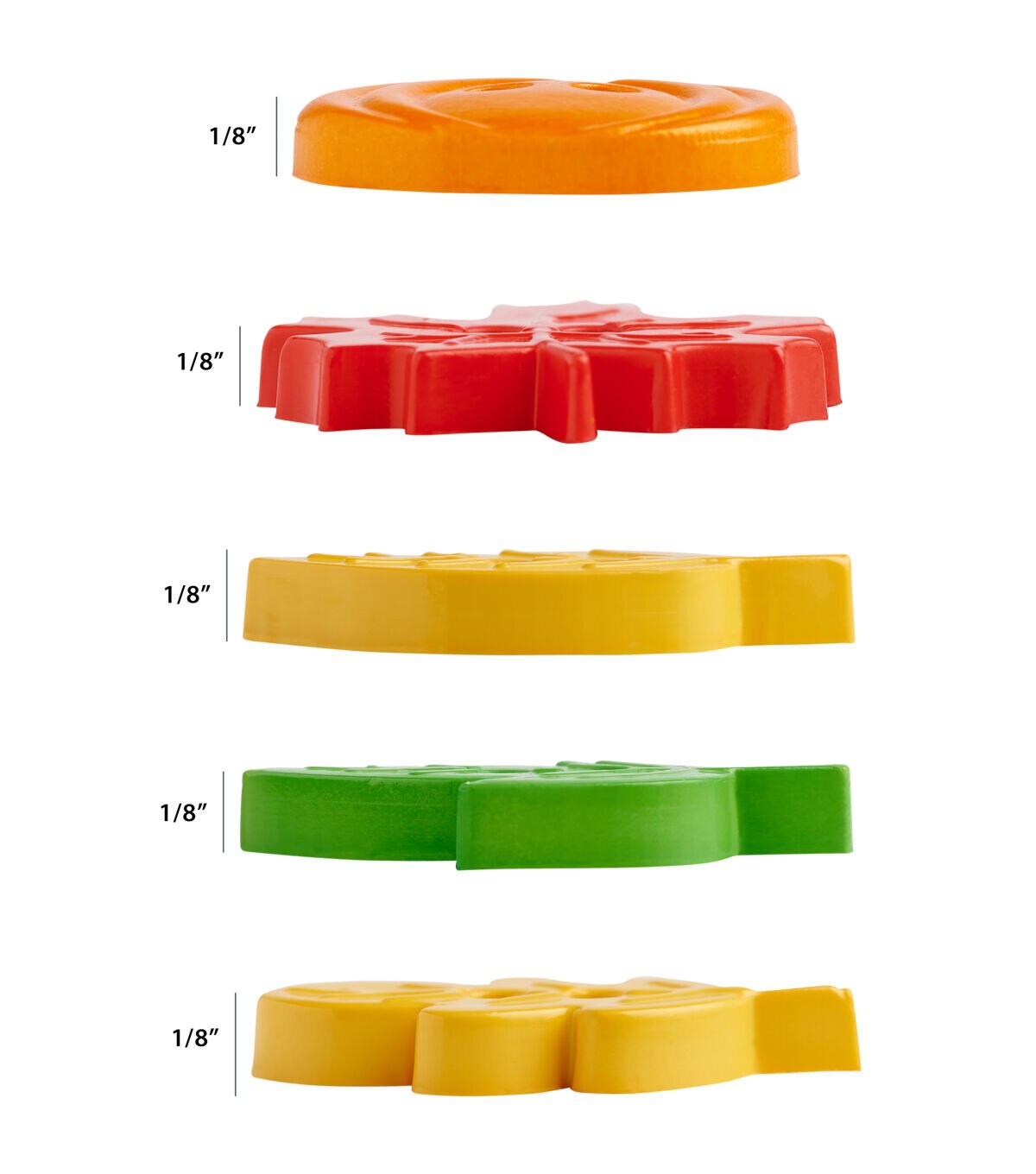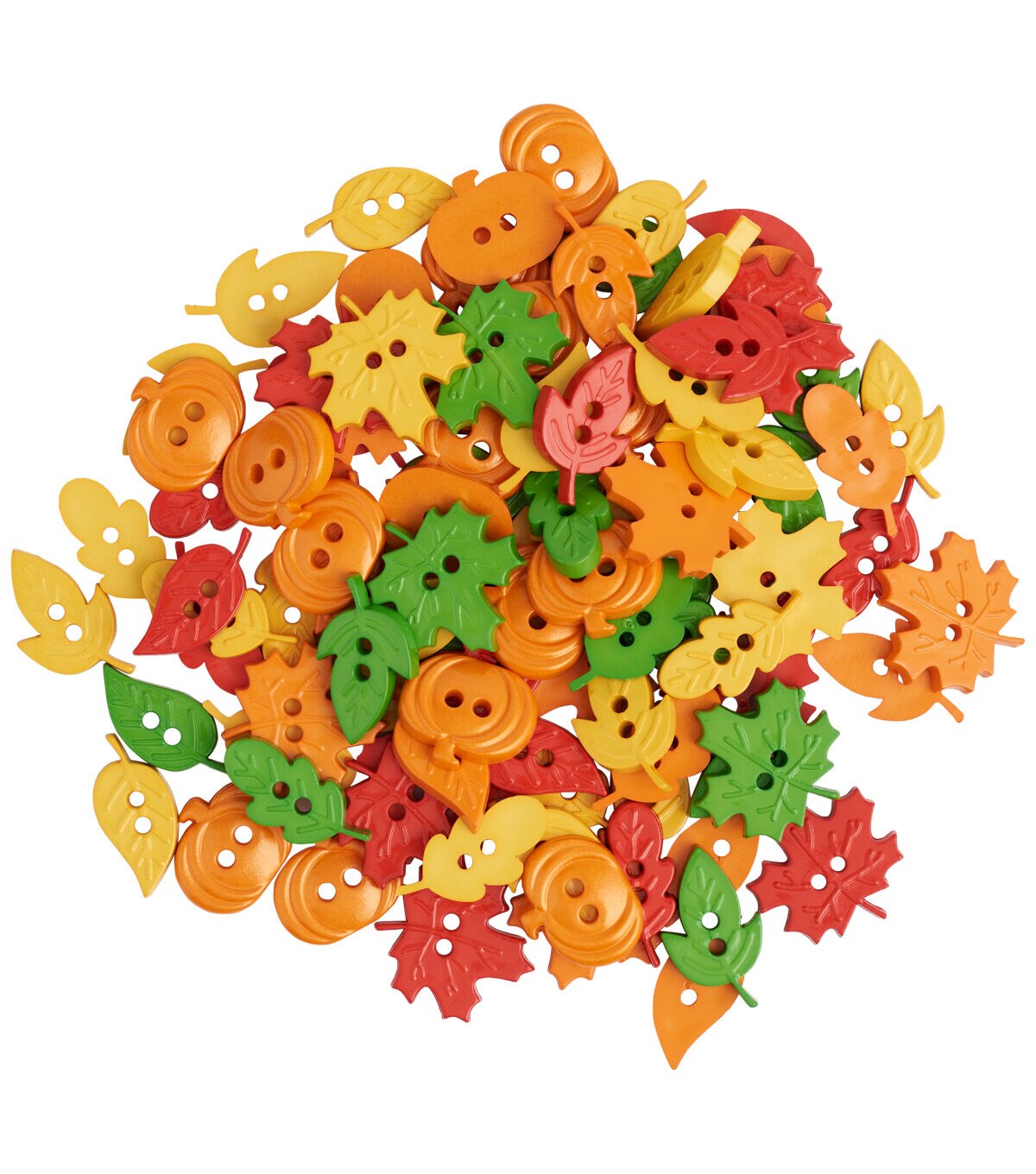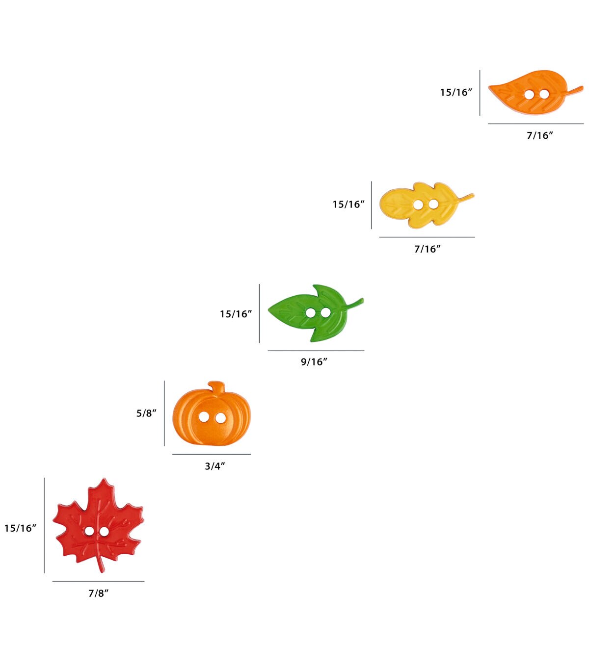The Favorite Findings Autumn 2 Hole Buttons Value Pack - Multi will be ideal for your Thanksgiving sewing projects. This pack includes buttons resembling leaves in a variety of shapes and hues and pumpkin-shaped buttons. You can use them to decorate aprons, fabric bags and more. Let your kids use them for their fall-themed papercrafting projects.