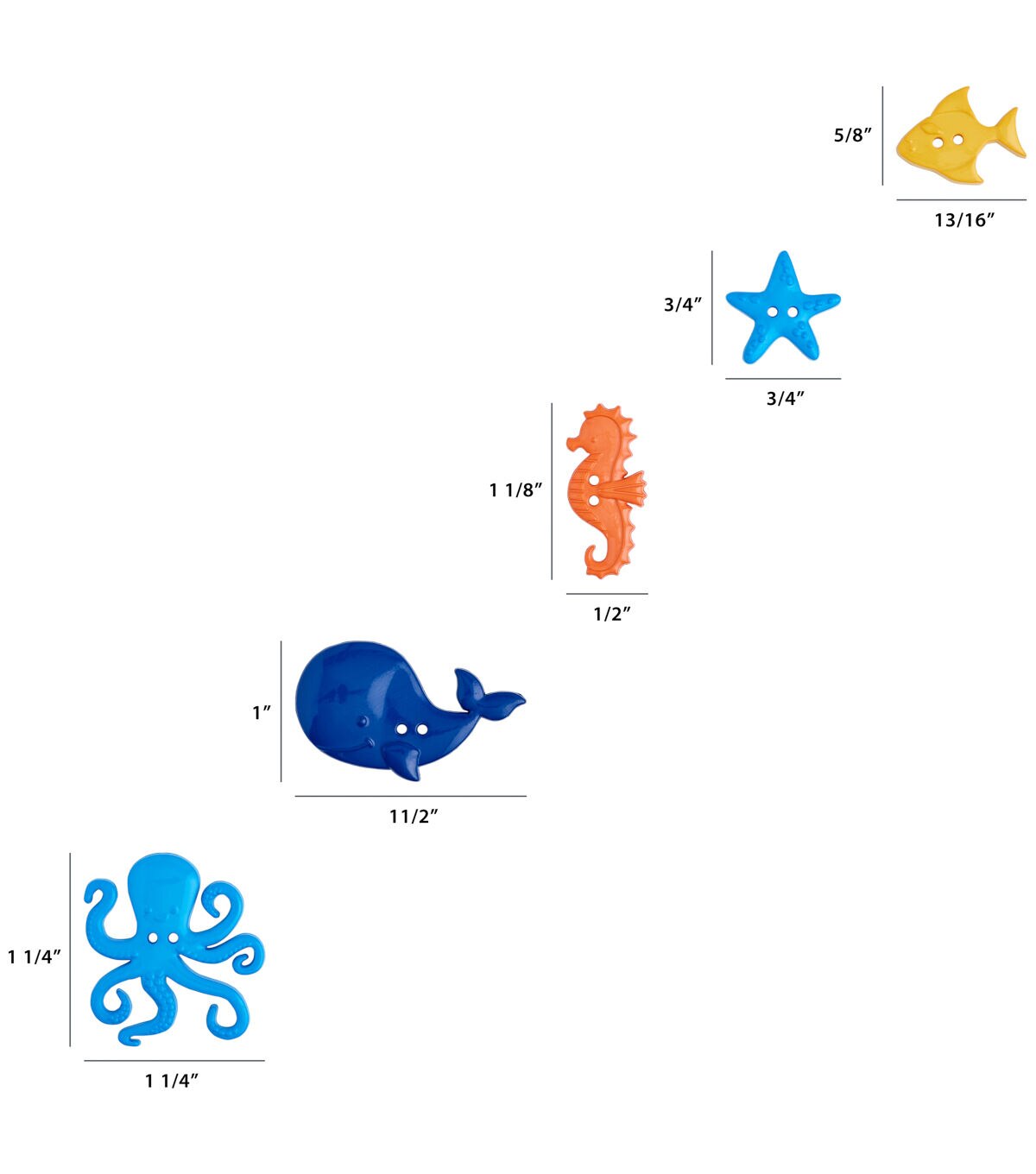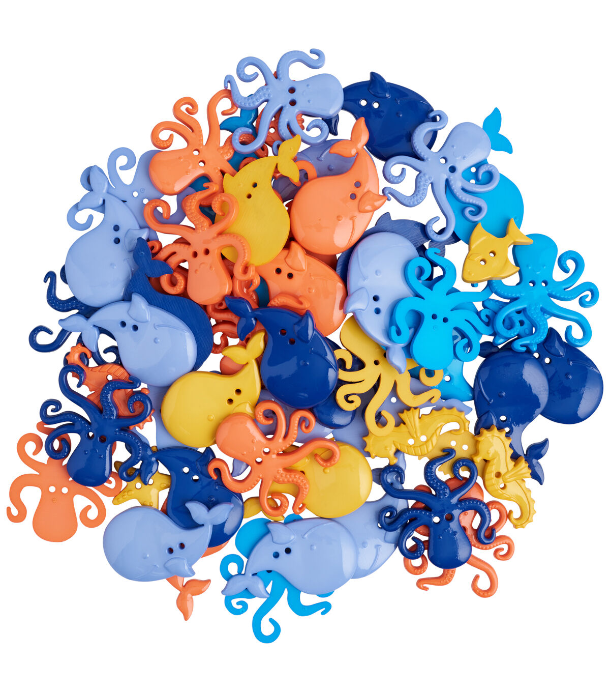 Give a fun, oceanic touch to handmade apparel with the Favorite Findings Sealife 2 Hole Buttons Value Pack - Multi. Sporting vivid hues and shaped like different sea creatures, these buttons will be perfect for your little sea lover’s dress, top, tee and more. They can be used for fastening or as mock buttons for visual charm.
