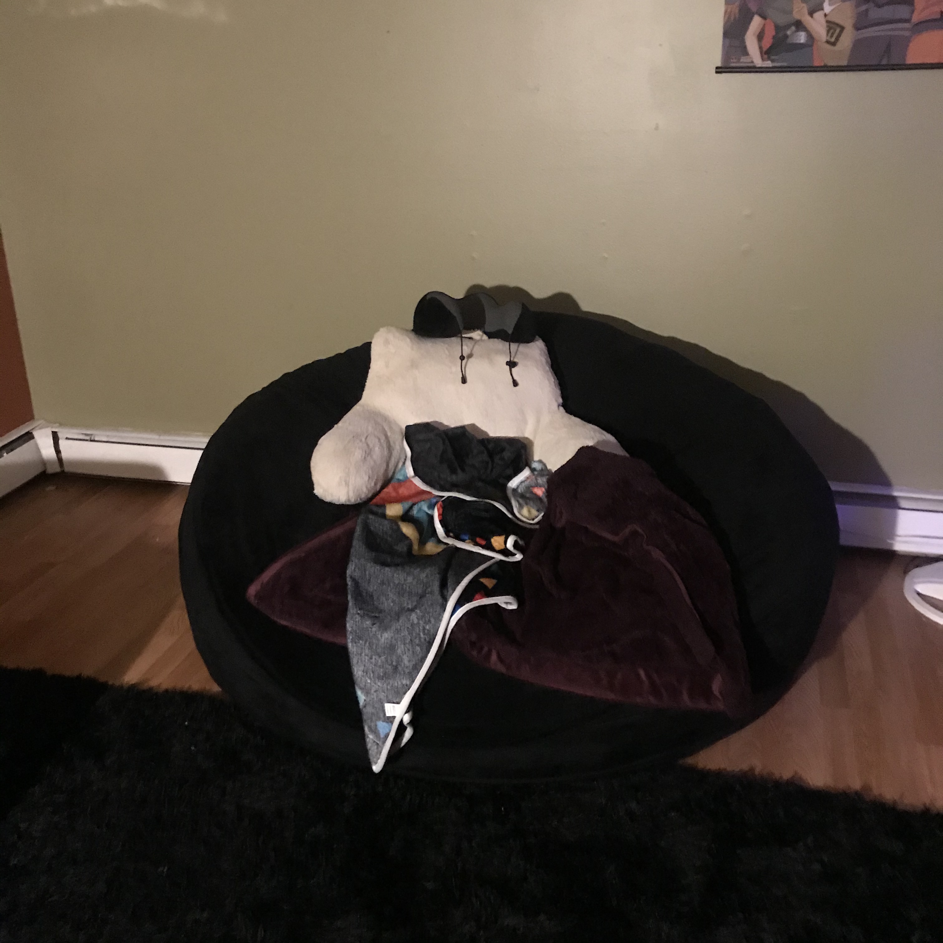 - Has material measuring approximately 6 feet in diameter. Depending on the surface of the floor and weight of the occupant, the bean bag chair will be between 60 and 68 inches across, and 34-38 inches in height when fully fluffed. The bean bag chair weights 65-70 pounds. Includes a removable, washable cover.