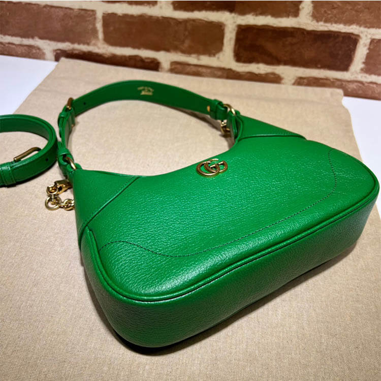 1:1 Mirror Quality Replica Gucci Aphrodite Small Shoulder Bag Style:731817 AAA9F 3727 Green soft leather Shiny gold-toned hardware Moire lining Double G Adjustable shoulder strap with 21.6″ drop Removable chain strap with 10.2″ drop Zip closure Small size: W9.9″ x H7.5″ x D2.8″