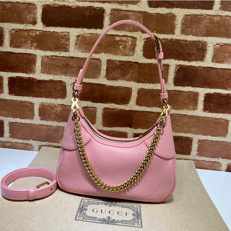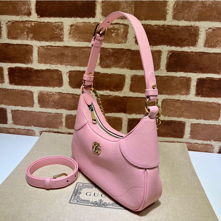 1:1 Mirror Quality Replica Gucci Aphrodite Small Shoulder Bag Style:731817 AAA9F 5815 Light pink soft leather Shiny gold-toned hardware Moire lining Double G Adjustable shoulder strap with 21.6″ drop Removable chain strap with 10.2″ drop Zip closure Small size: W9.9″ x H7.5″ x D2.8″