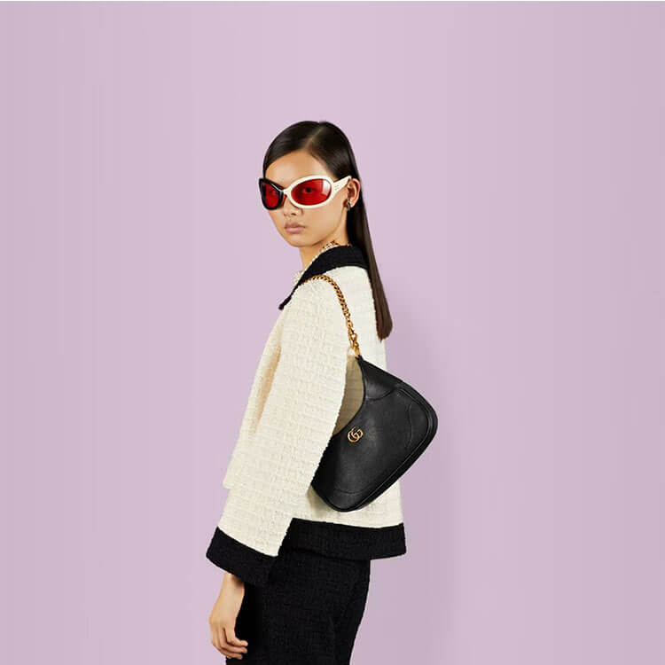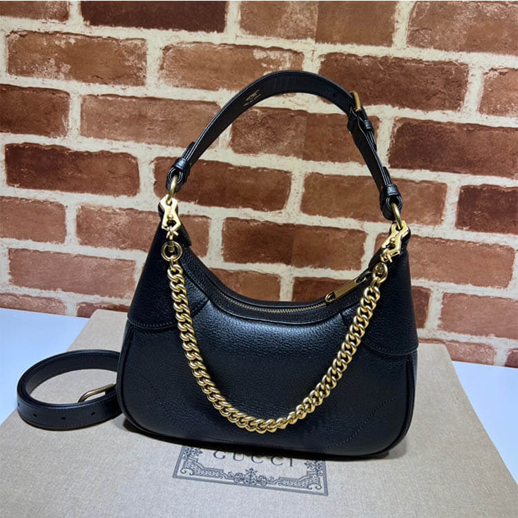 1:1 Mirror Quality Replica Gucci Aphrodite Small Shoulder Bag Style:731817 AAA9F 1000 Black soft leather Shiny gold-toned hardware Moire lining Double G Adjustable shoulder strap with 21.6″ drop Removable chain strap with 10.2″ drop Zip closure Small size: W9.9″ x H7.5″ x D2.8″
