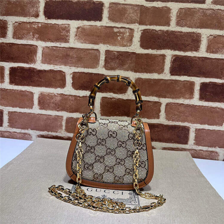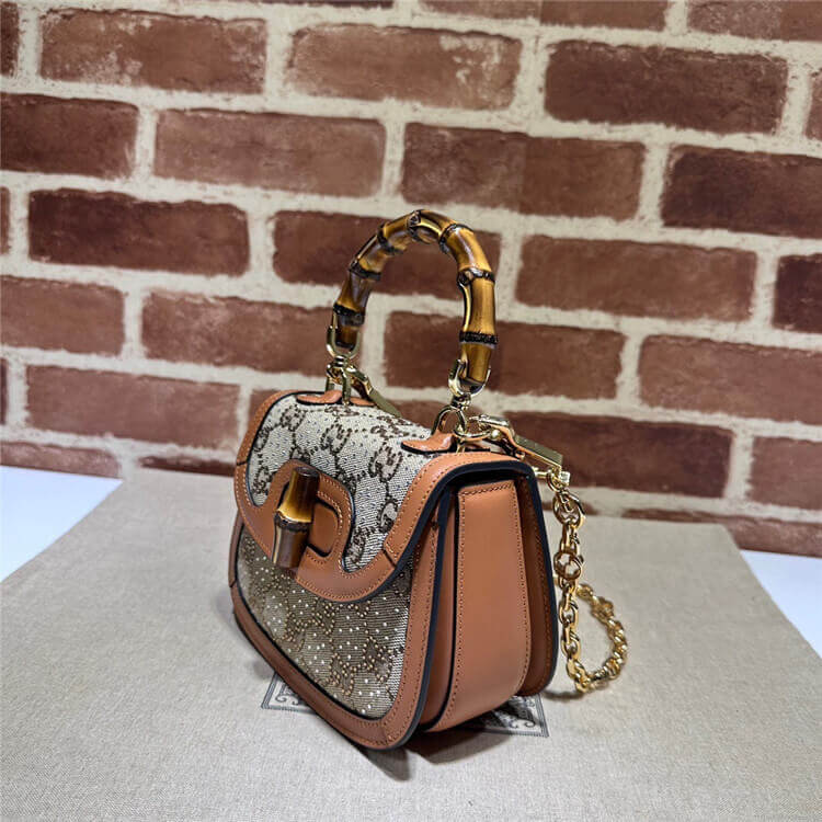 1:1 Mirror Quality Replica Gucci Bamboo 1947 Mini Top Handle Bag Style:735116 FAA4Z 2554 Beige and ebony canvas with GG crystal Bamboo hardware Cotton linen lining Inside: card holder Top handle with 3.1″ drop Removable chain shoulder strap with Interlocking G and 15.9″ drop 6.7″W x 5″H x 3.1″D