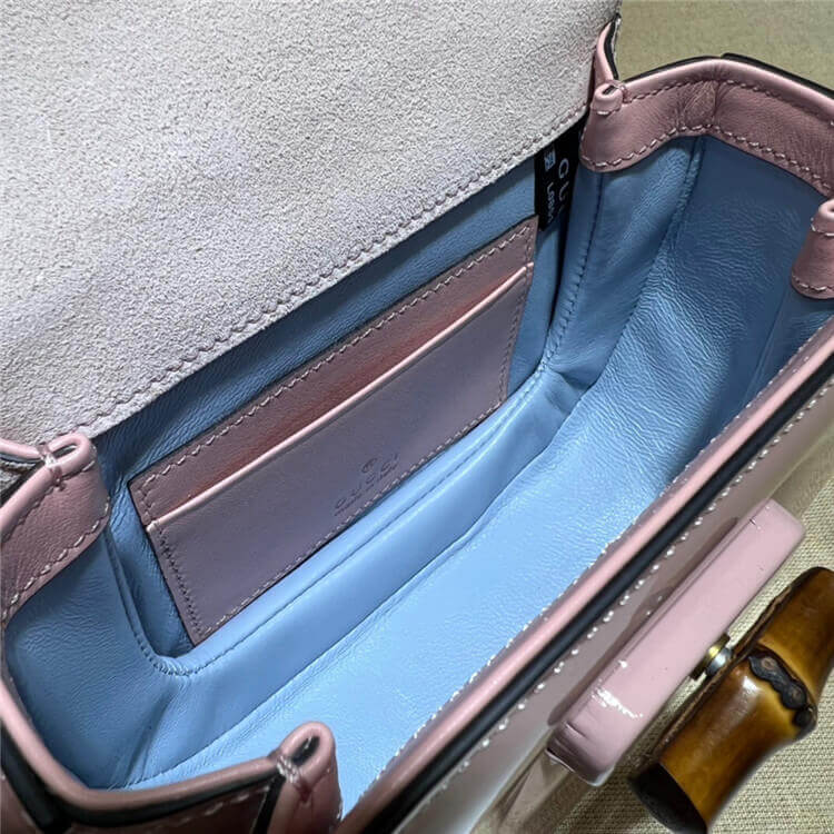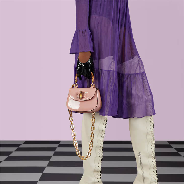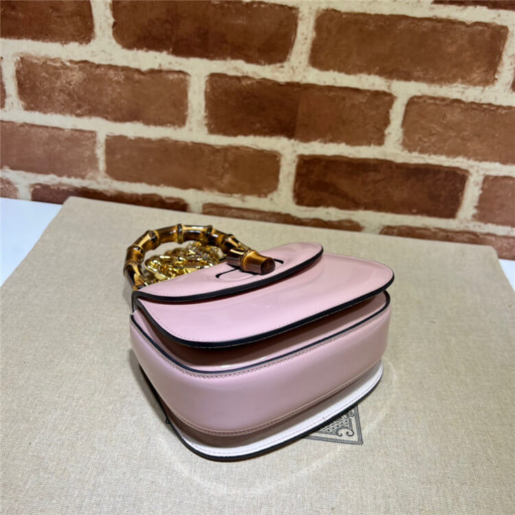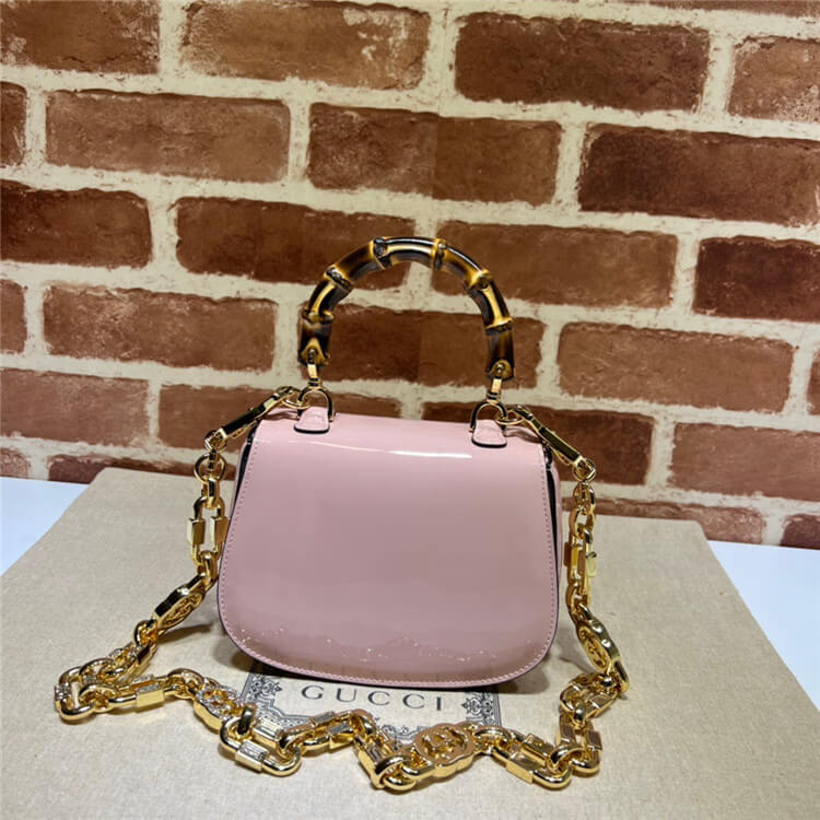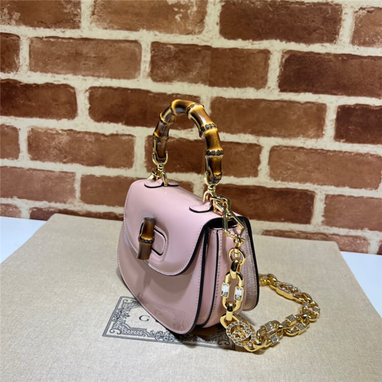 1:1 Mirror Quality Replica Gucci Bamboo 1947 Mini Top Handle Bag Style:724641 AABCE 6942 Light pink patent leather Gold-toned hardware Leather lining Top handle with 3.1″ drop Detachable chain shoulder strap with Interlocking G with crystals; strap drop 15.9″ Mini size: 6.7″W x 4.9″H x 3.1″D
