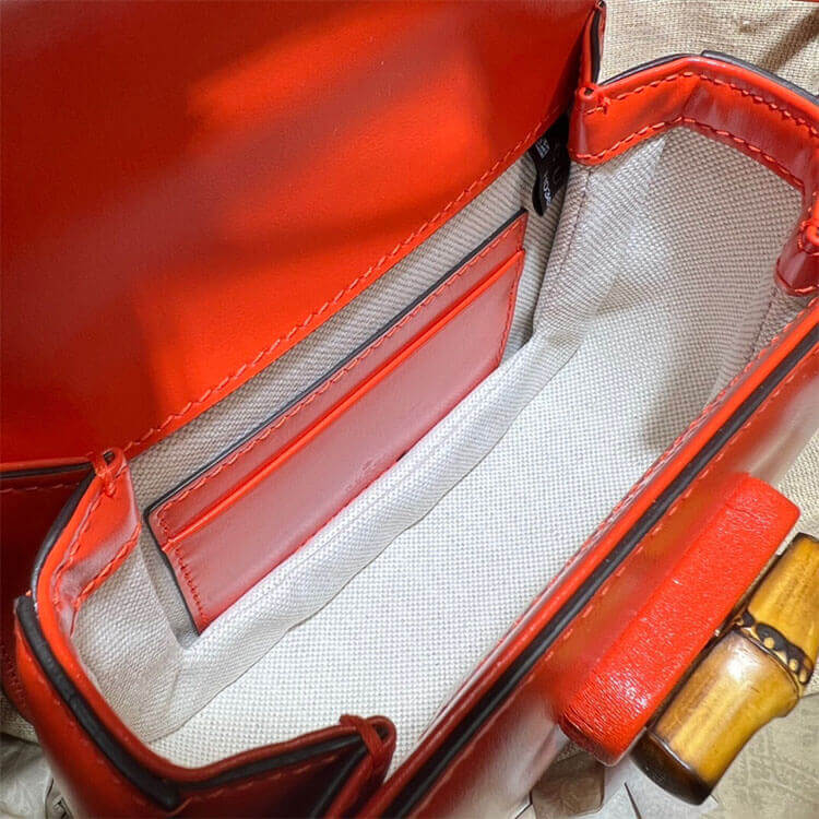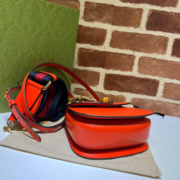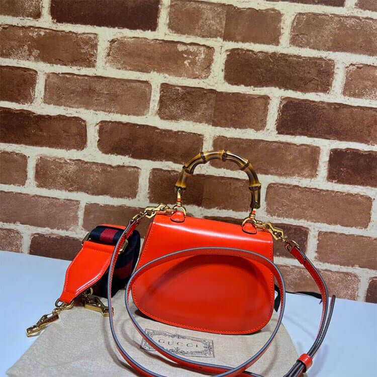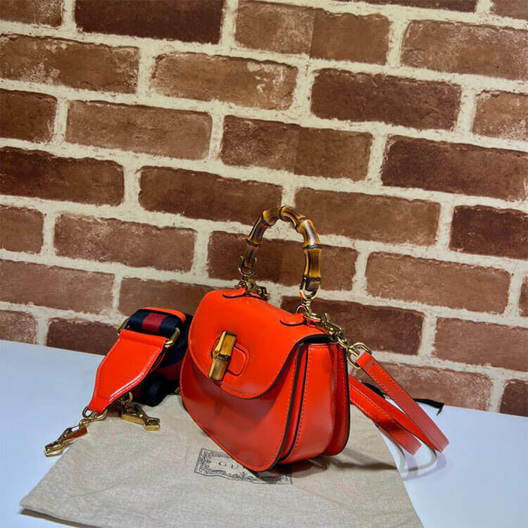 1:1 Mirror Quality Replica Gucci Bamboo 1947 Mini Top Handle Bag Style:686864 10ODT 7768 Orange leather Antique gold-toned and bamboo hardware Lining: cotton linen Inside: card holder Handle drop: 3.1″ Detachable strap with 21.7″ drop Mini size: 6.7″W x 4.7″H x 3″D The model is 5’8″ tall