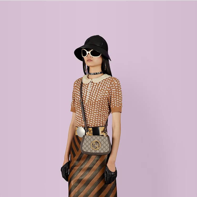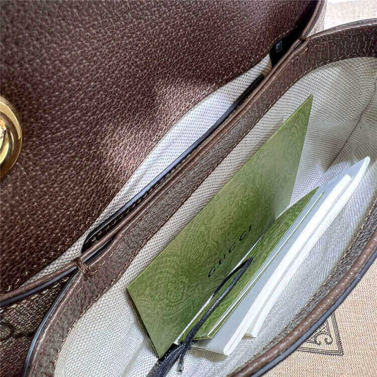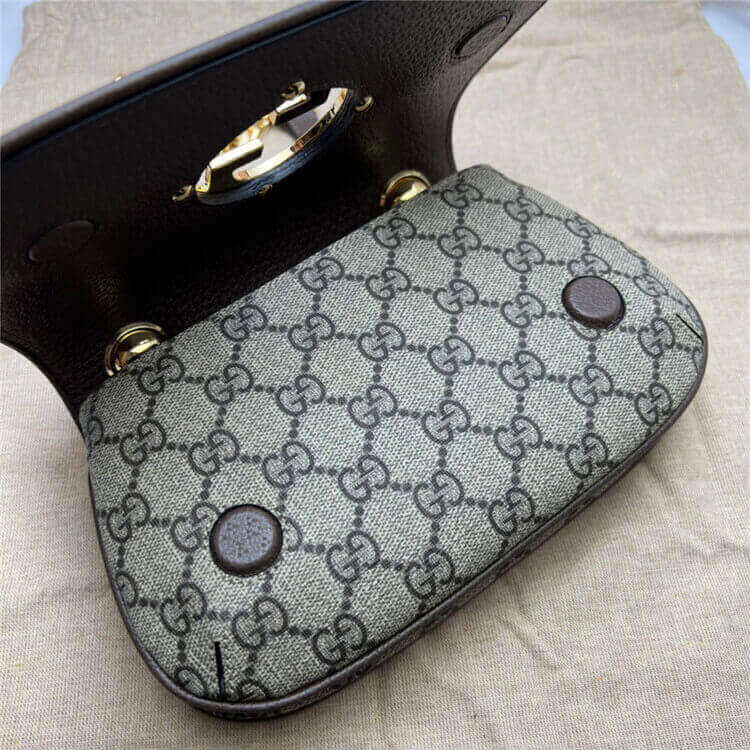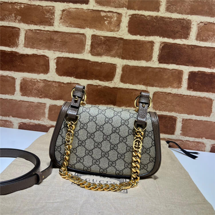 1:1 Mirror Quality Replica Gucci Blondie Mini Shoulder Bag Style:724645 K9GSG 8367 Beige and ebony GG Supreme canvas Brown leather trim Gold-toned hardware Round Interlocking G Interlocking G chain Inside: 2 main compartments, 1 open pocket Double shoulder strap Mini size: 8.4″W x 5.3″H x 2.7″D