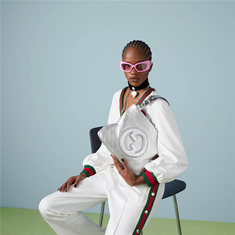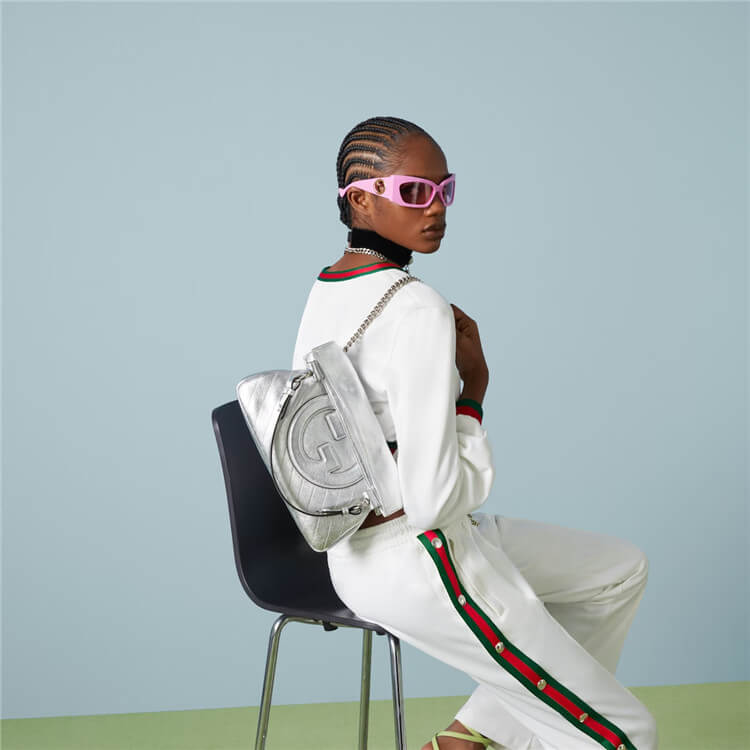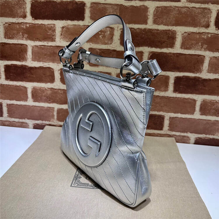 1:1 Mirror Quality Replica Gucci Blondie Small Tote Bag Style:751518 AACBO 8106 Silver lamé leather Cotton linen lining Round Interlocking G leather patch Inside: 3 main compartments and 1 zip pocket Top handle with 5.9″ drop Chain shoulder strap with 11.8″ drop Small size: 11.8″W x 9.4″H x 2.4″D