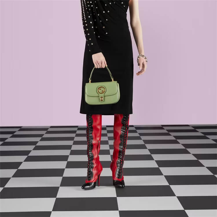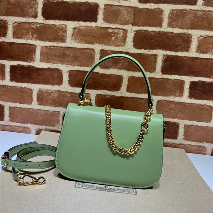 1:1 Mirror Quality Replica Gucci Blondie Top-Handle Bag Style:735101 UXX0G 3408 Light green leather Gold-toned hardware Round Interlocking G Inside: 1 zip pocket, 2 open pockets Top handle Chain shoulder strap and additional leather strap Push clasp closure 9″W x 6″H x 4.3″D