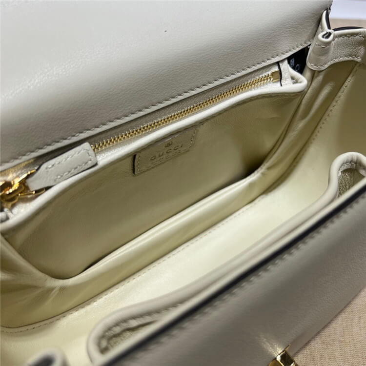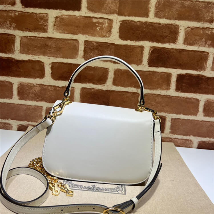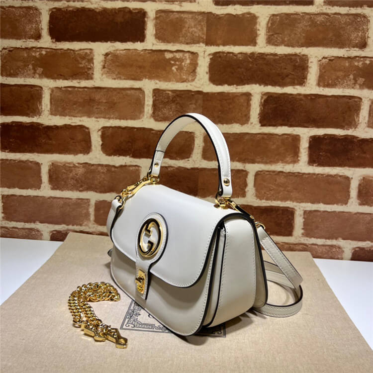 1:1 Mirror Quality Replica Gucci Blondie Top-Handle Bag Style:735101 UXX0G 9022 White leather Gold-toned hardware Round Interlocking G Inside: 1 zip pocket, 2 open pockets Top handle Chain shoulder strap and additional leather strap Push clasp closure 9″W x 6″H x 4.3″D