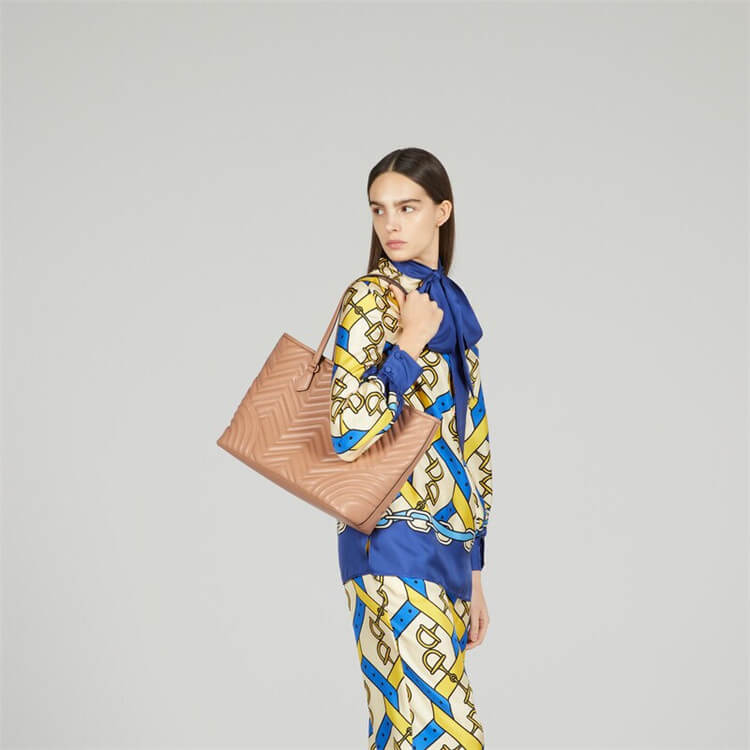 1:1 Mirror Quality Replica Gucci GG Marmont Large Tote Bag Style:739684 DAAAH 2754 Rose beige matelasse chevron leather Rose beige enamel brass hardware Cotton linen lining Double G Inside: 1 zipped pocket Leather handle with 9″ drop Weight: 1.7lbs, approximately Large size: 15.1″W x 11.4″H x 5.5″D