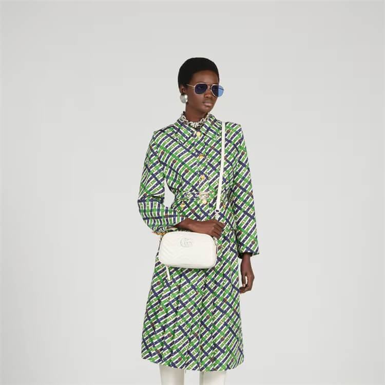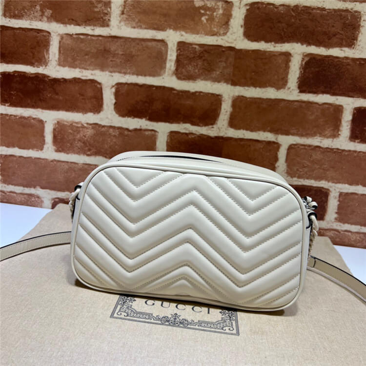 1:1 Mirror Quality Replica Gucci GG Marmont Matelasse Shoulder Bag Style:447632 DAAAJ 9022 White matelasse chevron leather White enamel brass hardware Double G Interior open pocket Adjustable chain shoulder strap with 23.6″ drop. Can also be worn as a crossbody bag. Zip closure Small size: 9.5″W x 5″H x 3″D