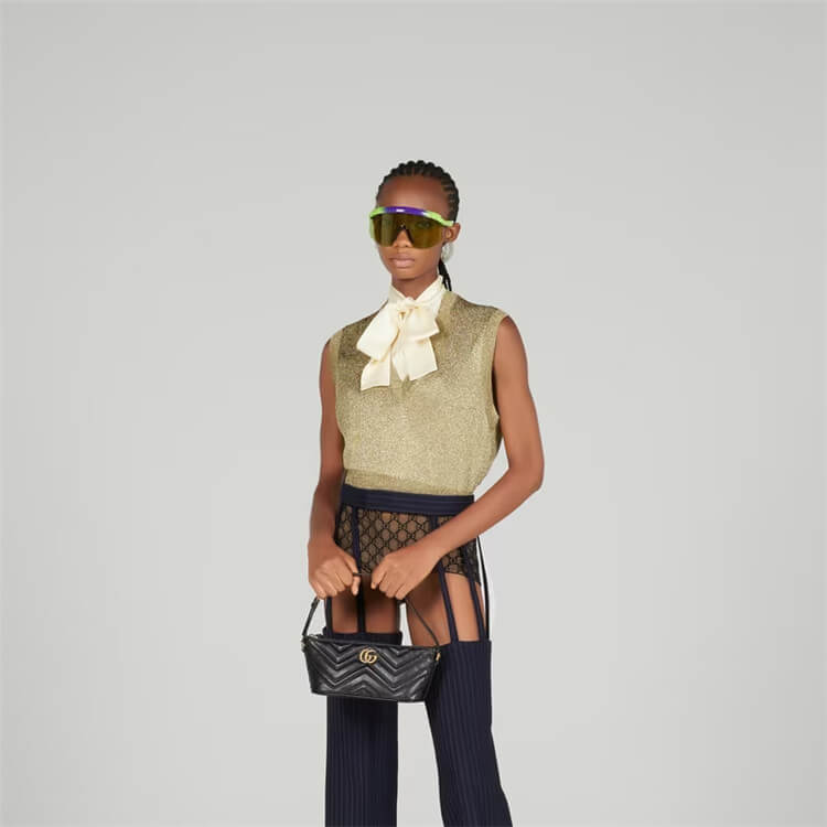 1:1 Mirror Quality Replica Gucci GG Marmont Shoulder Bag Style:739166 AABZB 1000 Black matelasse chevron leather Antique gold-toned hardware Microfiber lining with a suede-like finish Double G Inside: 1 open card holder Top handle with 5.9″ drop Zip closure Weight: .46lbs approximately 9″W x 4.7″H x 3.9″D