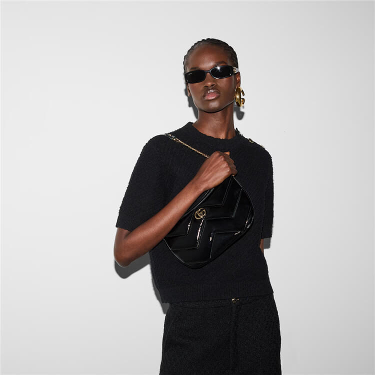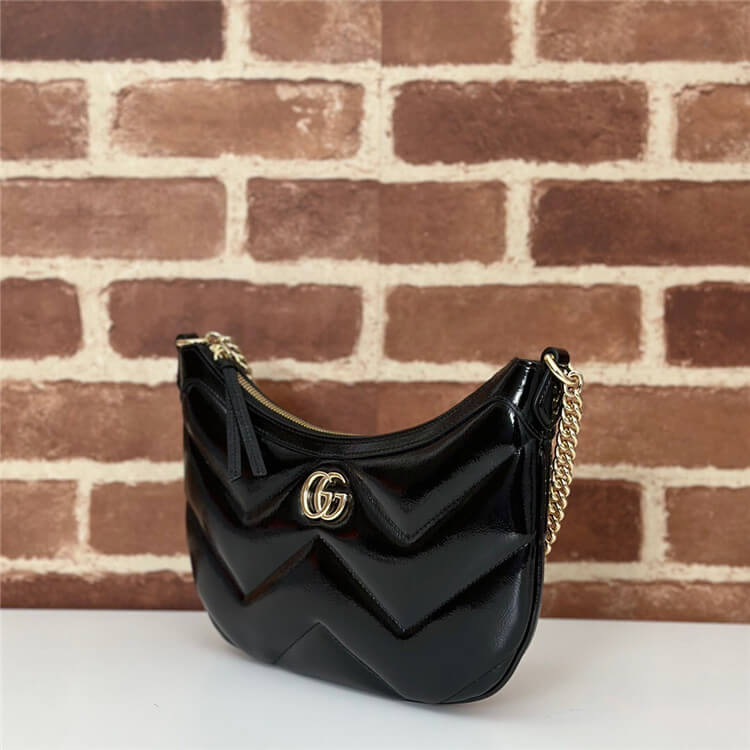 1:1 Mirror Quality Replica Gucci GG Marmont Small Shoulder Bag Style:777263 0AABA 1000 Black quilted chevron patent leather Black patent leather trim Light gold-toned hardware Black microfiber lining Double G Inside: 1 open pocket Shoulder strap drop: 9.2″ Zip closure Small size: 10.2″W x 6.6″H x 1.5″D