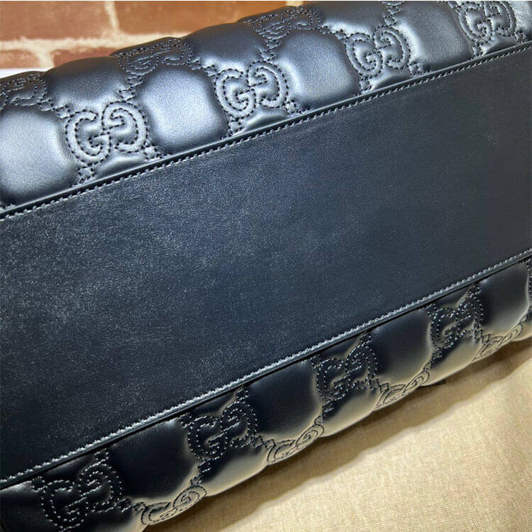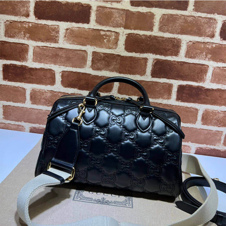 1:1 Mirror Quality Replica Gucci GG Matelasse Medium Bag Style:702242 UM8HG 1046 Two detachable straps: ivory nylon, black leather Black GG Matelassé leather Gold-toned hardware Cotton linen lining Double G Leather shoulder strap: 23.2″ drop; Canvas strap: 19.7″ drop Zip closure 12.2″W x 7.5″H x 8.7″D