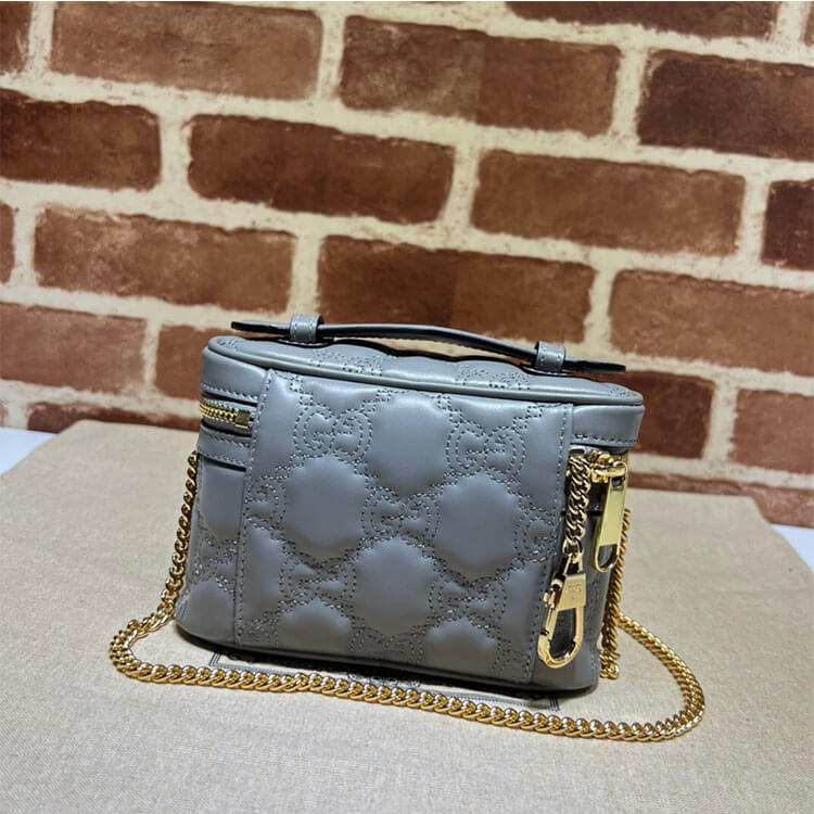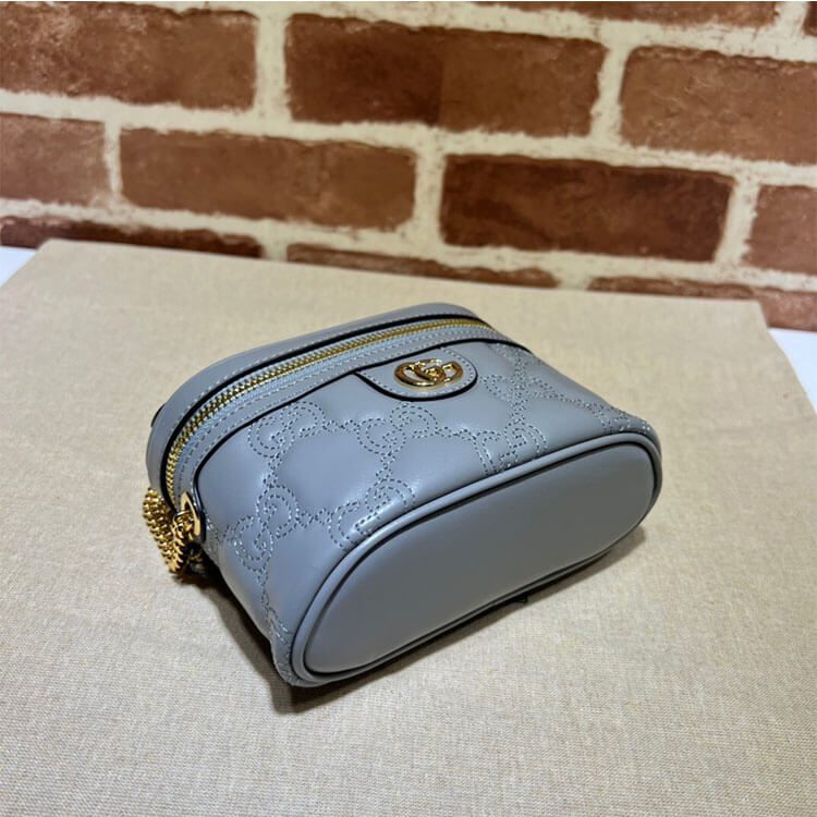 1:1 Mirror Quality Replica Gucci GG Matelasse Top Handle Mini Bag Style:723770 UM8IG 1275 Grey GG Matelasse leather Gold-toned hardware Double G Inside: 1 open pocket and hook Handle with .6″ drop Chain shoulder strap with 19.7″ drop Zip closure 6.3″W x 4.1″H x 2″D