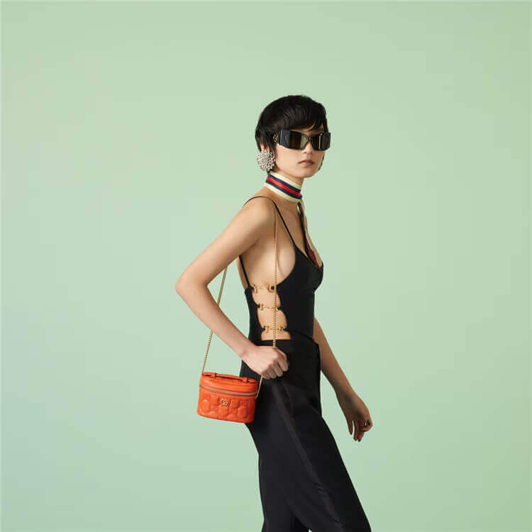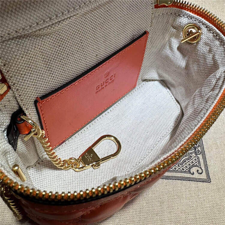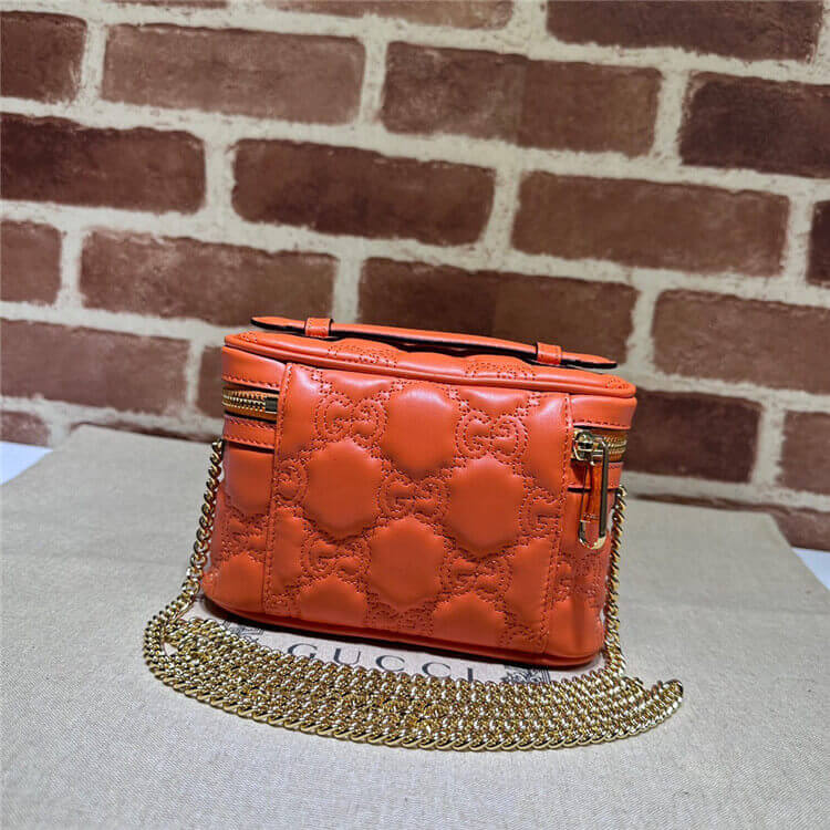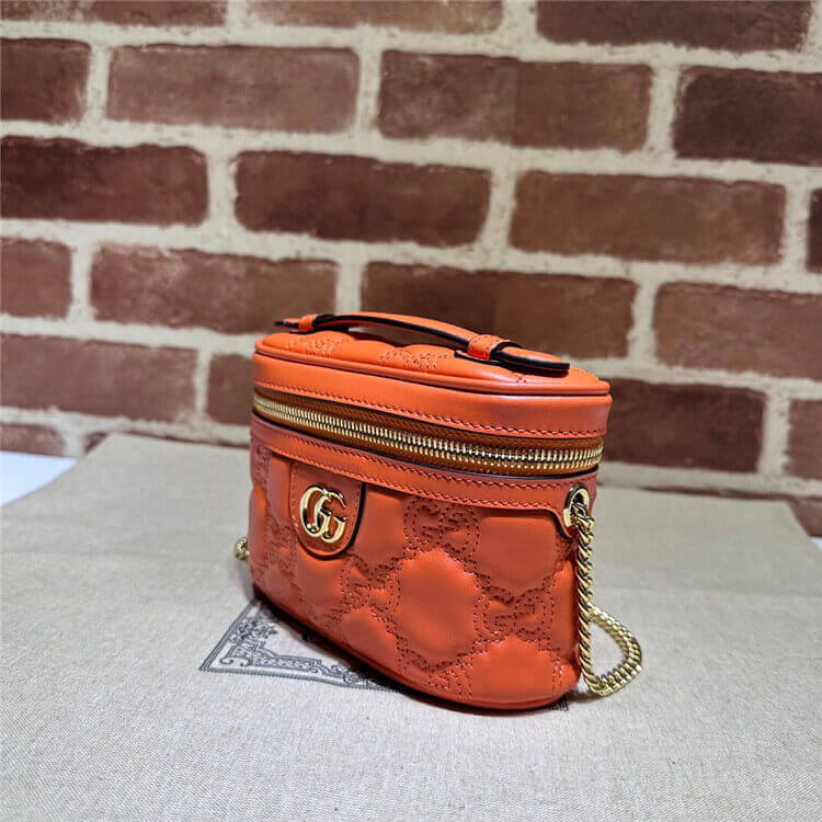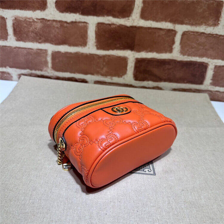 1:1 Mirror Quality Replica Gucci GG Matelasse Top Handle Mini Bag Style:723770 UM8IG 7519 Orange leather Gold-toned hardware Cotton linen lining Double G Inside: 1 open pocket and hook Handle with .6″ drop Chain shoulder strap with 19.7″ drop Zip closure 6.3″W x 4.1″H x 2″D