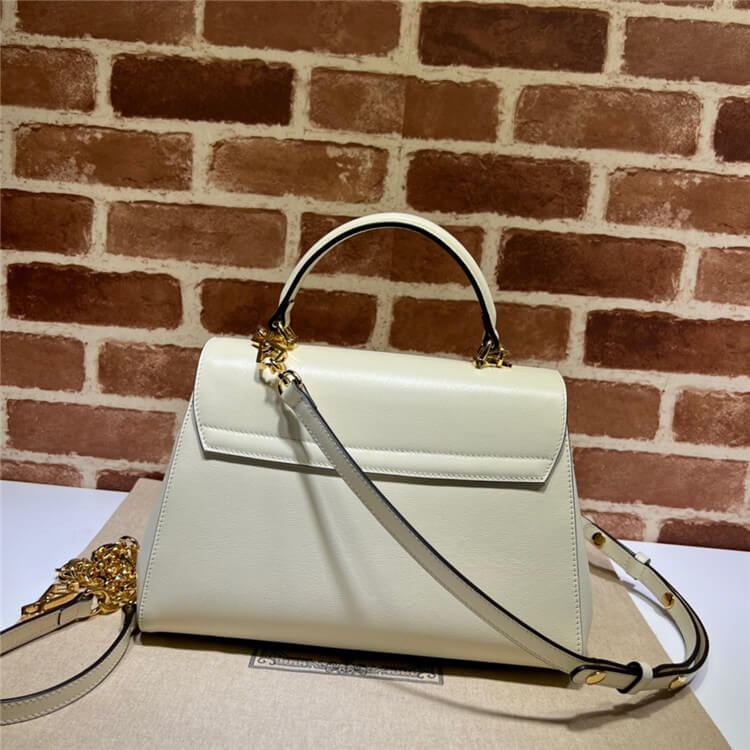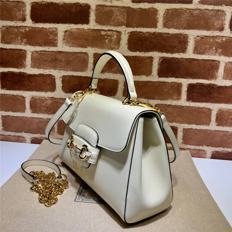 1:1 Mirror Quality Replica Gucci Horsebit 1955 Medium Bag Style:702049 AAA7G 9022 White leather Shiny gold-toned hardware Horsebit Inside: 2 main compartments and 1 zip pocket 19.7″ chain strap and 21.6″ detachable leather strap Medium size: 11.4″W x 7.8″H x 5.1″D