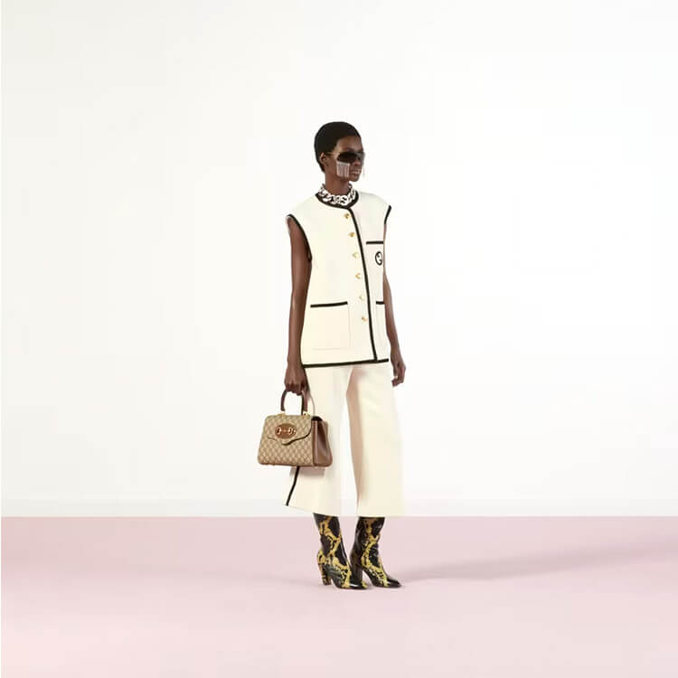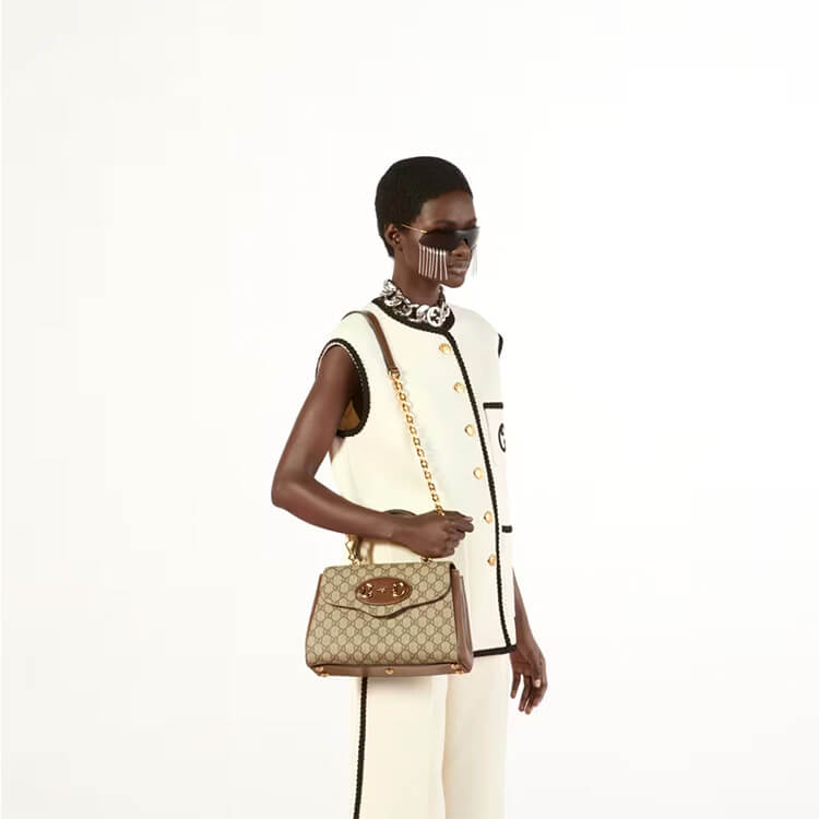 1:1 Mirror Quality Replica Gucci Horsebit 1955 Medium Bag Style:702049 9AAAJ 8563 Beige and ebony GG Supreme canvas Brown leather trim Shiny gold-toned hardware Horsebit Inside: 2 main compartments and 1 zip pocket 19.7″ chain strap and 21.6″ detachable leather strap Medium size: 11.4″W x 7.8″H x 5.1″D