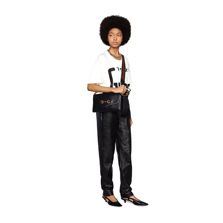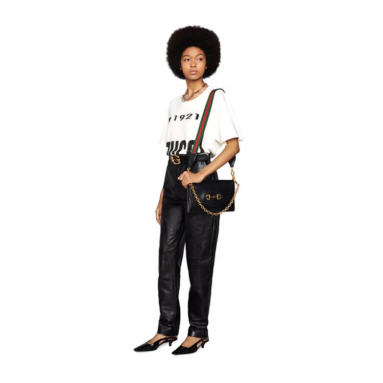 1:1 Mirror Quality Replica Gucci Horsebit 1955 Small Bag Style:677286 18YSX 1060 Black leather Gold-toned hardware Horsebit Inside open pocket Detachable chain shoulder strap: 21cm; Detachable Web shoulder strap: 40cm Approximate weight: 600 gr. Small size: W26cm x H16cm x D4cm The model is 170.5cm tall