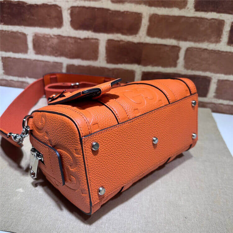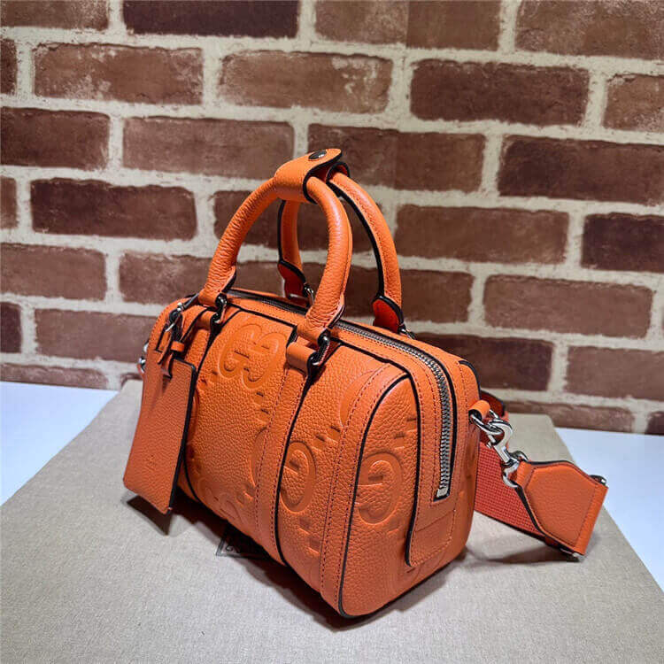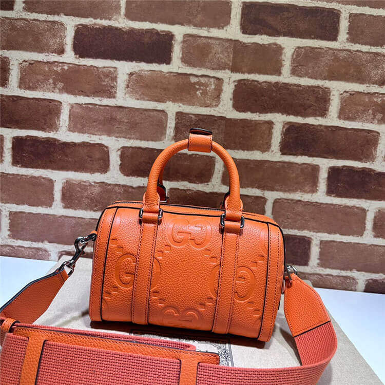 1:1 Mirror Quality Replica Gucci Jumbo GG Mini Duffle Bag Style:725292 AABY7 7505 Orange jumbo GG leather Cotton linen lining Removable luggage tag Handle with 3.5″ drop Adjustable shoulder strap with 18.5″ drop Zip closure Weight: 2lbs approximately 8.6″W x 5.9″H x 4.9″D