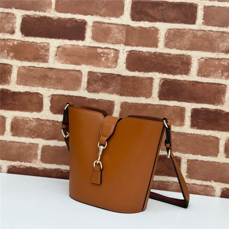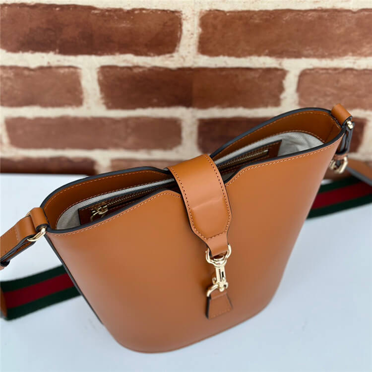1:1 Mirror Quality Replica Gucci Mini Bucket Shoulder Bag Style:782908 AABHE 2141 Brown leather Light gold-toned hardware Green and red Web Cotton linen lining Zip pocket with Gucci crest puller Adjustable shoulder strap with 16.5″ drop Hook closure Mini size: 7.2″W x 8″H x 5″D
