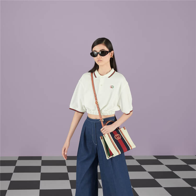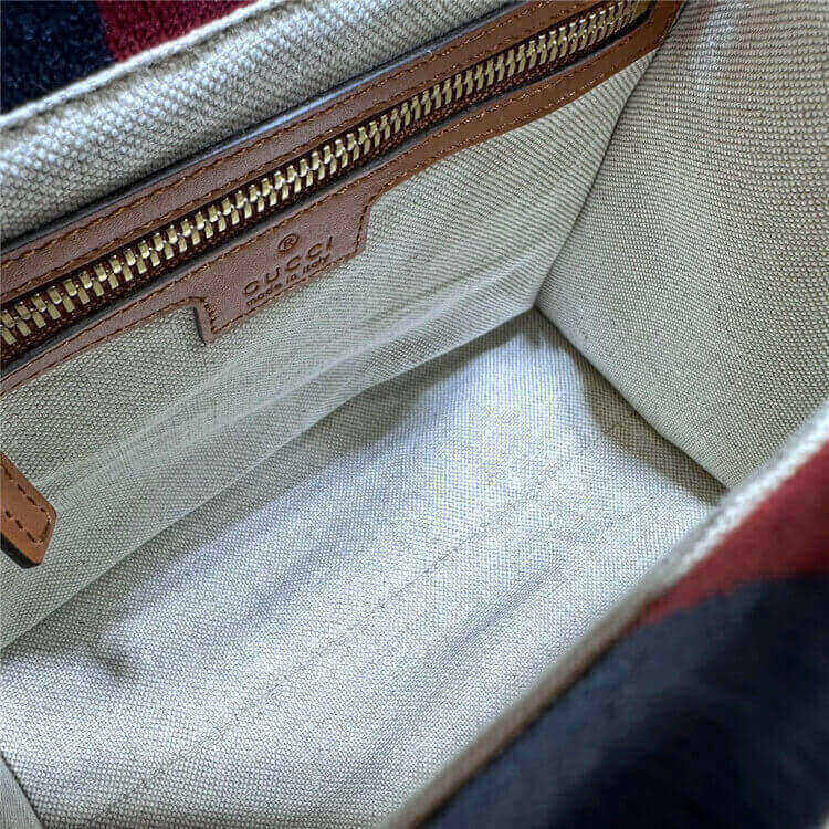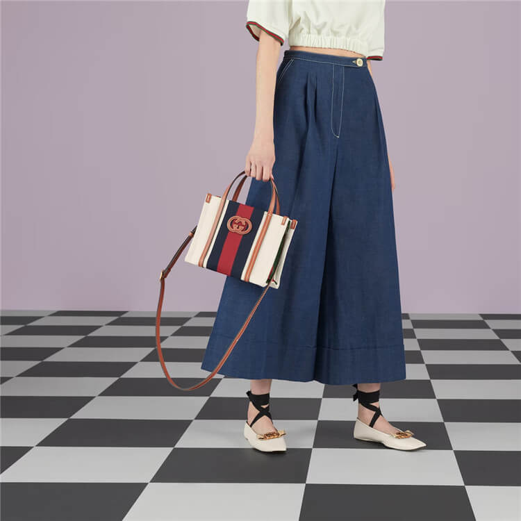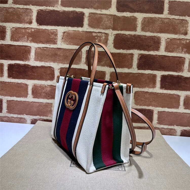 1:1 Mirror Quality Replica Gucci Mini Interlocking G Tote Bag Style:727735 FABCL 9553 White cotton canvas Brown leather trim Blue and red Web stripe Interlocking G leather patch Inside: 1 zip pocket Double handle with 4″ drop Detachable and adjustable shoulder strap Mini size: 9″H x 7″W x 4.5″D