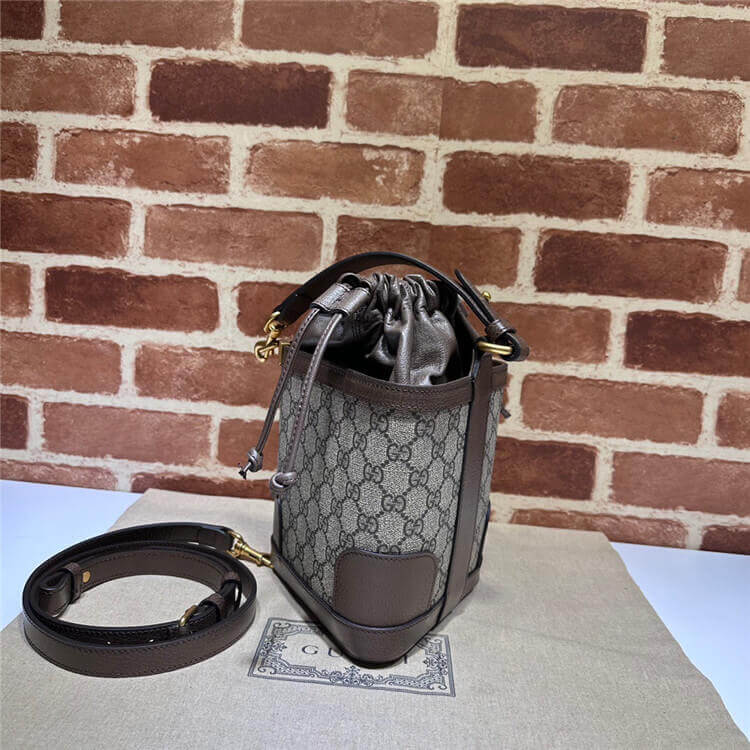 1:1 Mirror Quality Replica Gucci Ophidia GG Bucket Bag Style:752583 9AADO 8746 Beige and ebony GG Supreme canvas Brown leather trim Gold-toned hardware Green and red Web Triangular shape Double G Inside: 1 leather card slot Shoulder strap with 18.1″ drop Drawstring closure 6.3″W x 7.1″H x 2″D