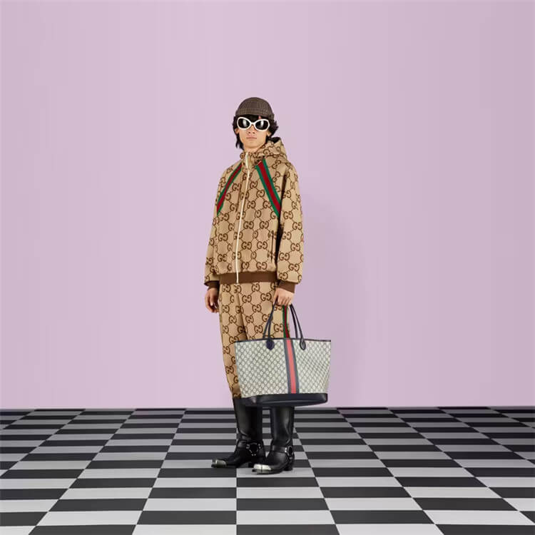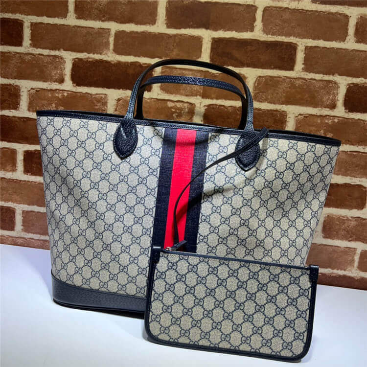 1:1 Mirror Quality Replica Gucci Ophidia GG Large Tote Bag Style:726755 2YGAT 8562 Beige and blue GG Supreme canvas Blue leather trim Blue and red Web Cotton linen lining Inside: 1 zip pouch Handle with 8.3″ drop Weight: 1.7lbs approximately 15.7″W x 13″H x 7.5″D