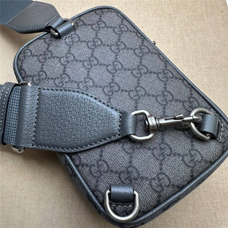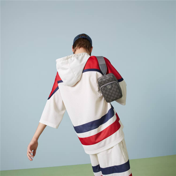 1:1 Mirror Quality Replica Gucci Ophidia GG Mini Bag Style:752565 UULHK 8576 Grey and black GG Supreme canvas Grey leather trim Palladium-toned hardware Cotton linen lining Double G Inside: 2 card slots External zip pocket Shoulder strap with 20.5″ drop Zip closure 4.7″W x 7.1″H x 2.7″D