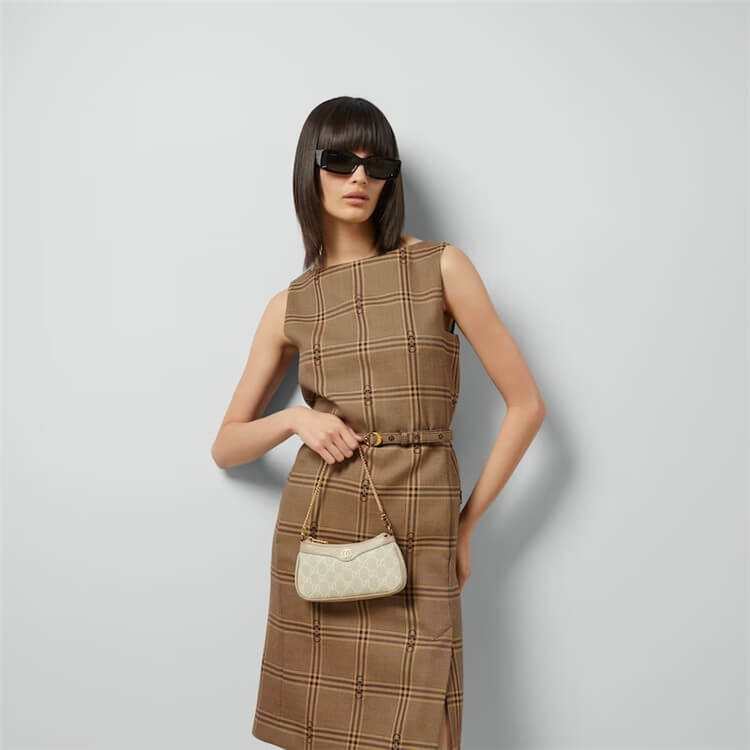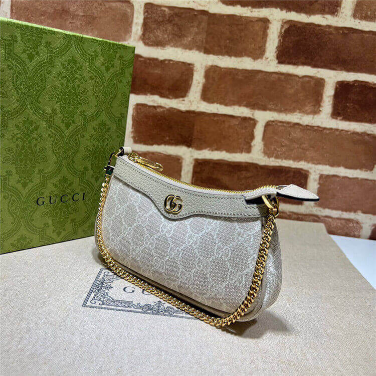 1:1 Mirror Quality Replica Gucci Ophidia Mini Bag Style:764960 FACJT 9641 Beige and white GG Suoreme canvas Beige leather trim Gold-toned hardware Cotton linen lining Double G Inside: 1 open pocket Chain top handle with 18cm drop Top zip closure W19cm x H10cm x D3cm