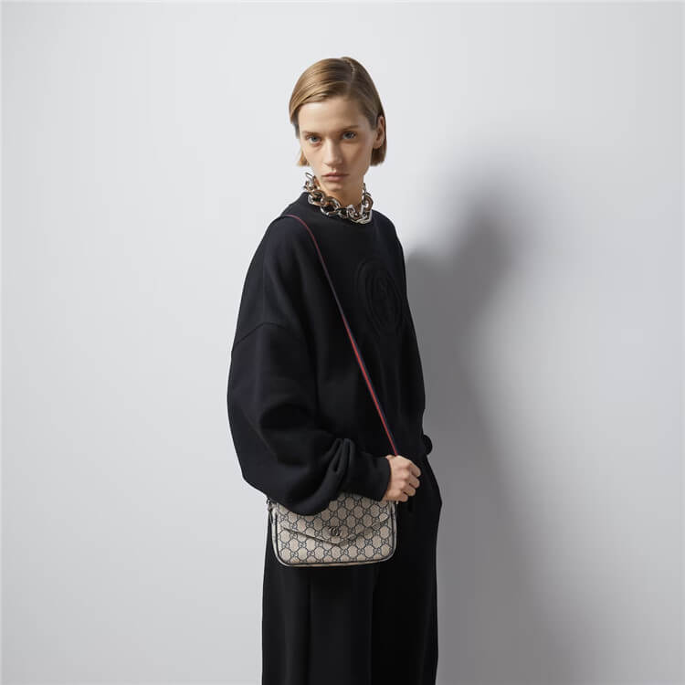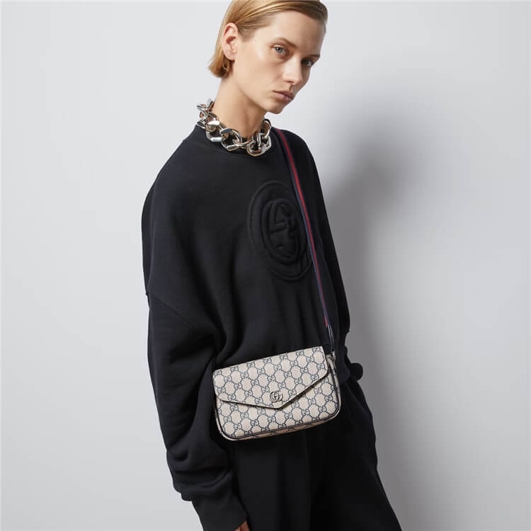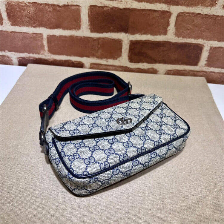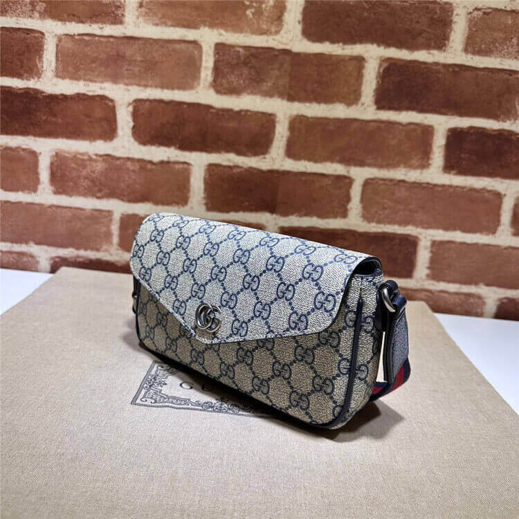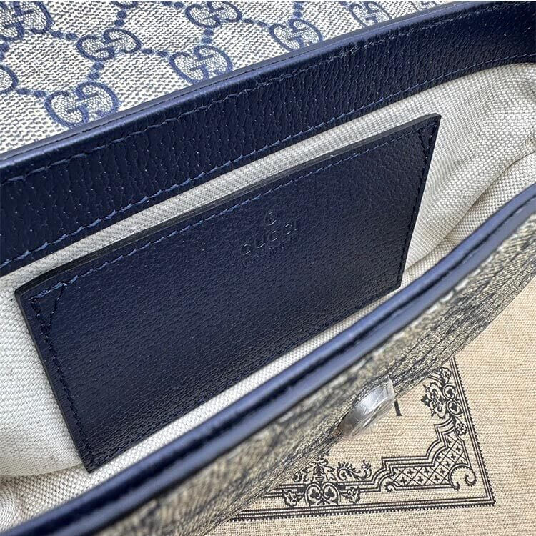1:1 Mirror Quality Replica Gucci Ophidia Mini Bag Style:764961 FACU3 4047 Beige and blue GG Supreme canvas Blue leather trim Palladium-toned hardware Cotton linen lining Double G Inside: 1 open pocket Adjustable Web shoulder strap with 55cm drop Snap button closure W22cm x H13cm x D4cm
