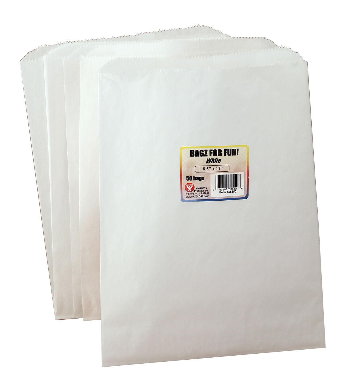 HYGLOSS-Bagz For Fun! Whether you use these paper bags for school lunches or various craft activities; they are sure to please. Each one is a pinch-bottom style bag and measures 11x8-1/2 inches. This package contains fifty white paper bags. Made in USA.